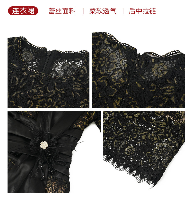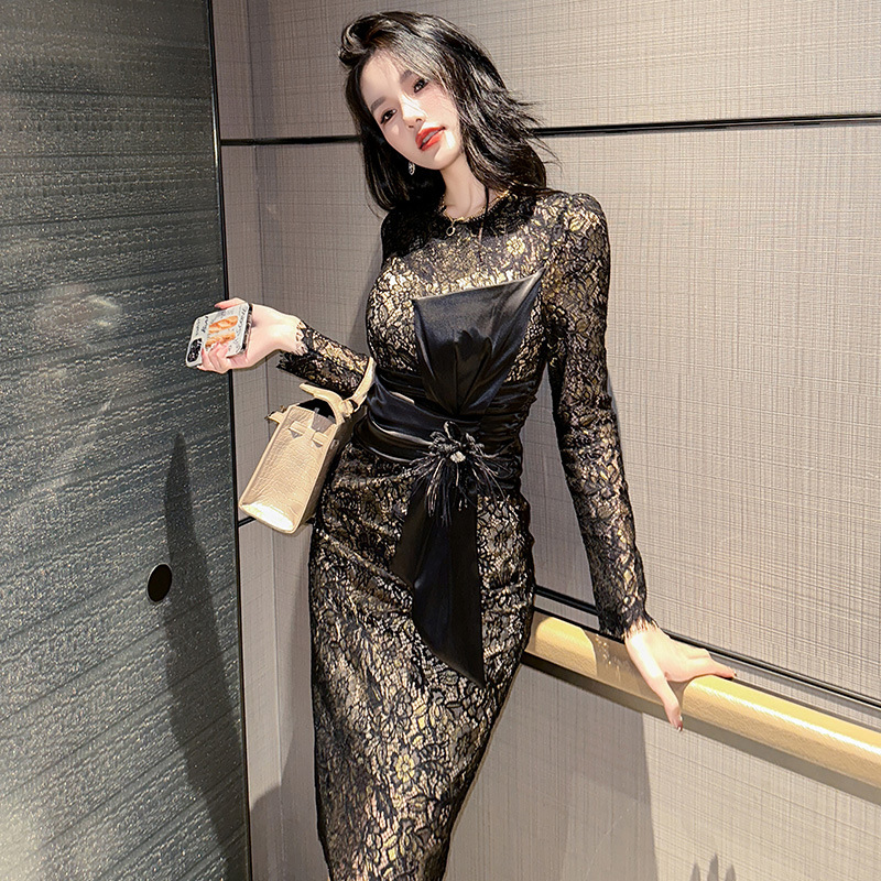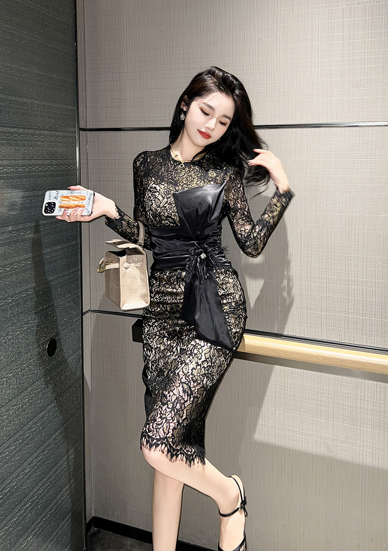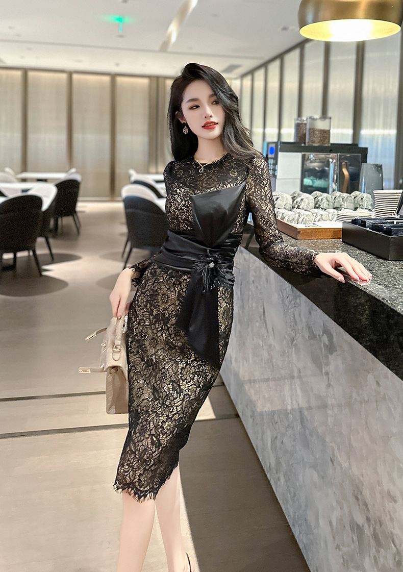 C-2782# 2023秋季新款跨境时尚圆领蝴蝶结减龄蕾丝修身包臀连衣裙女20747