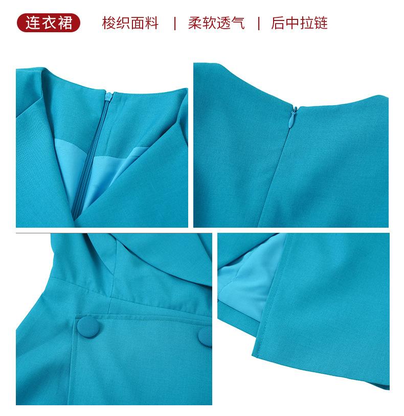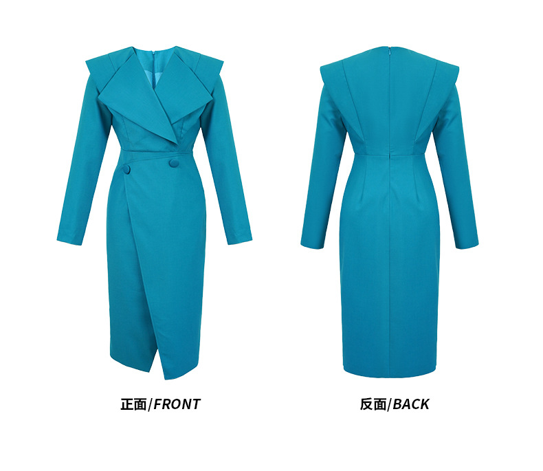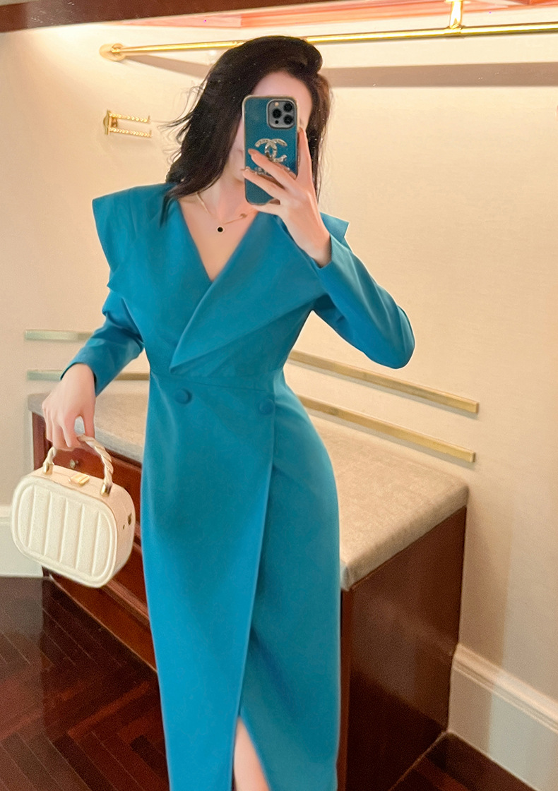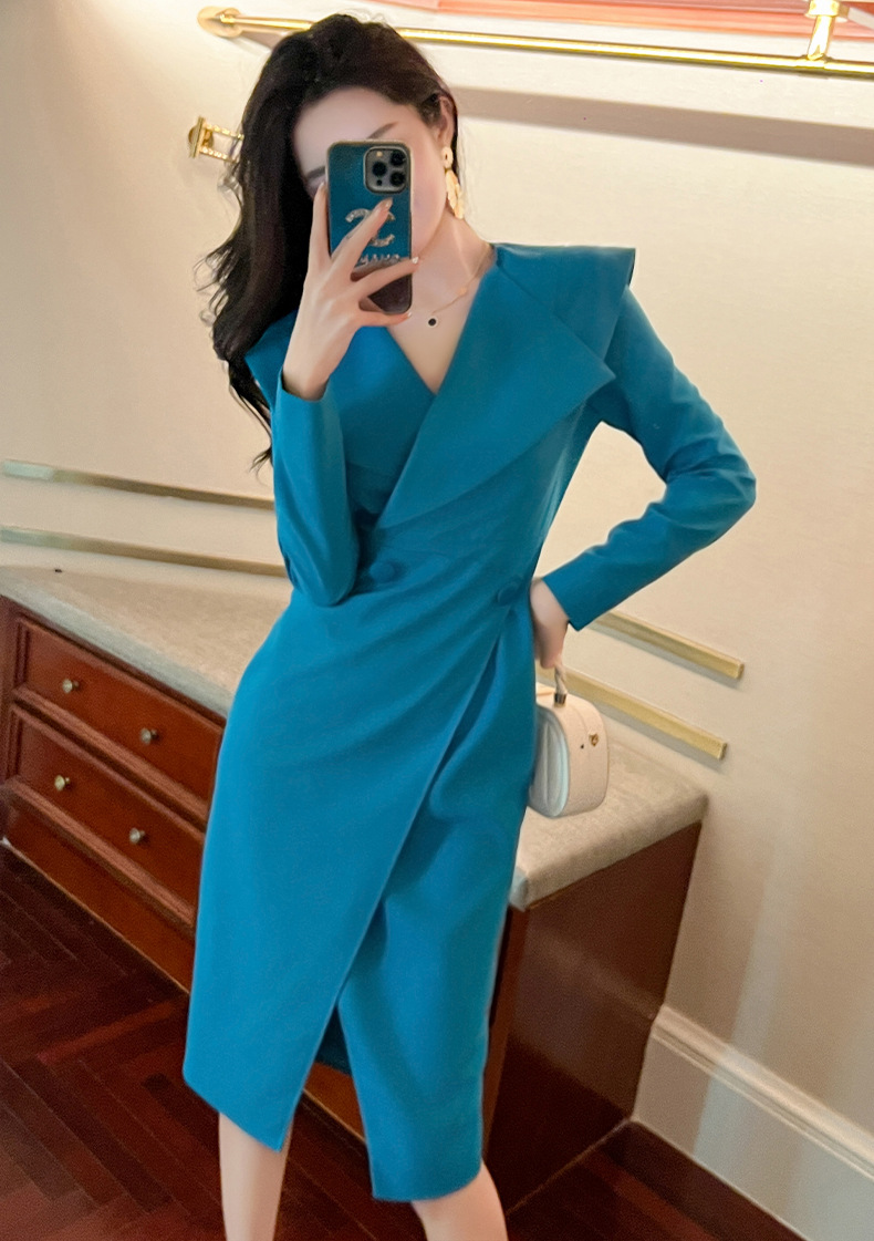 C-2842# 2023秋冬装新款女通勤气质方领收腰开叉蓝色长袖连衣裙修身50492