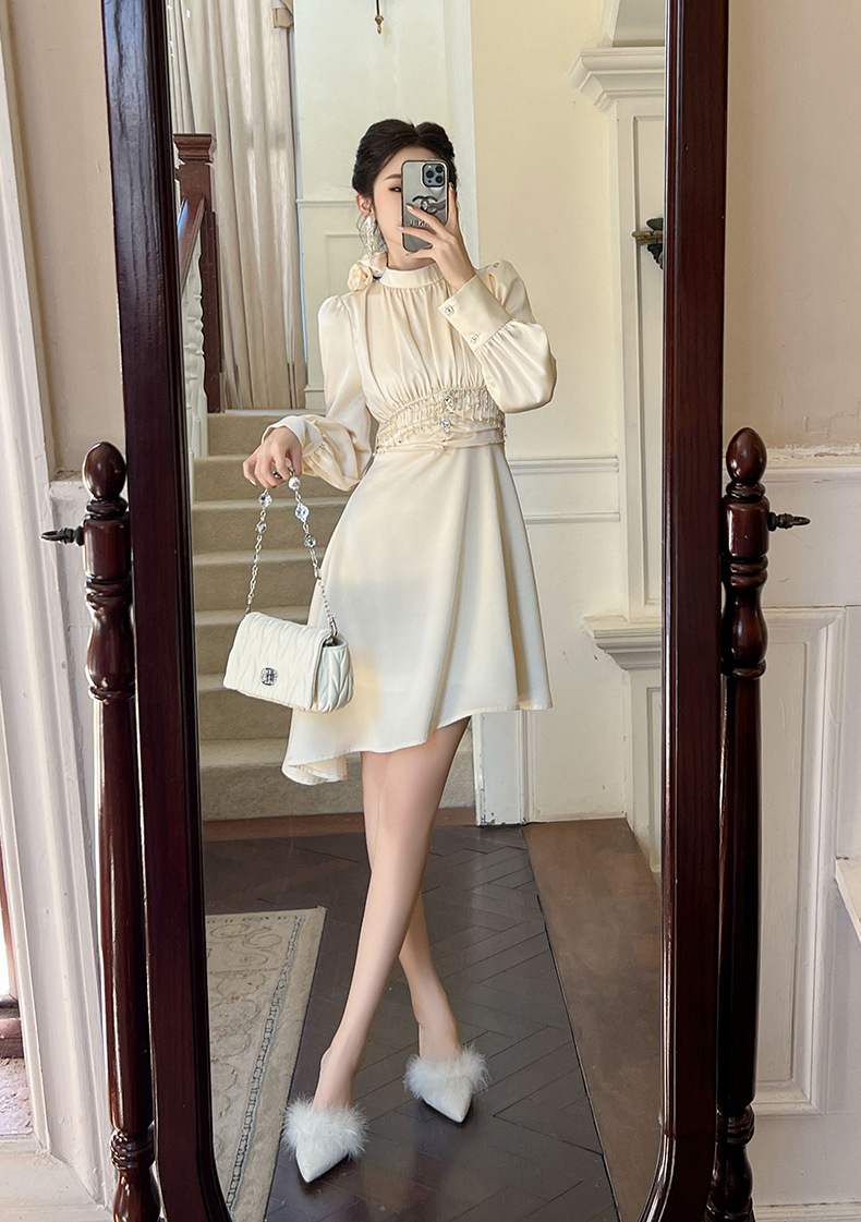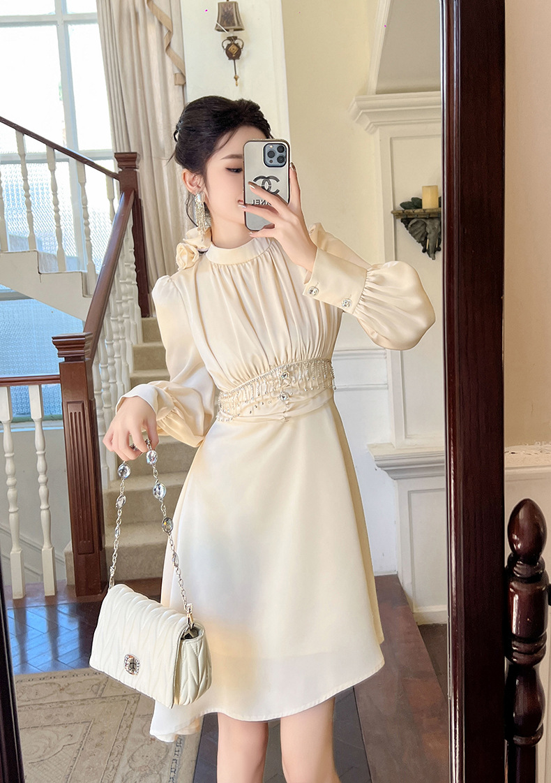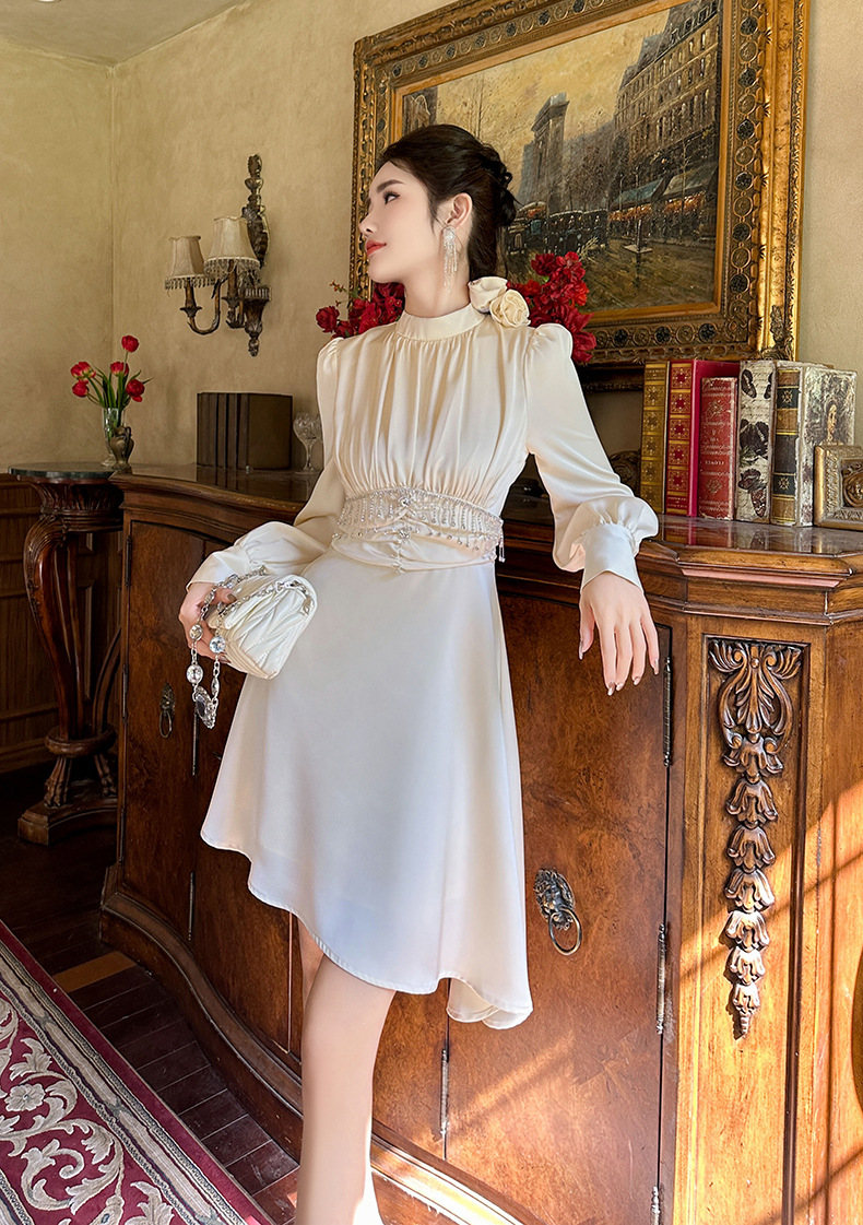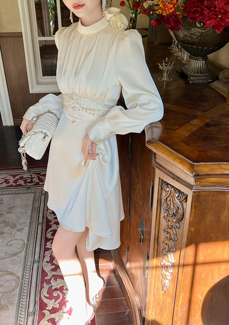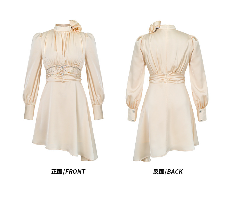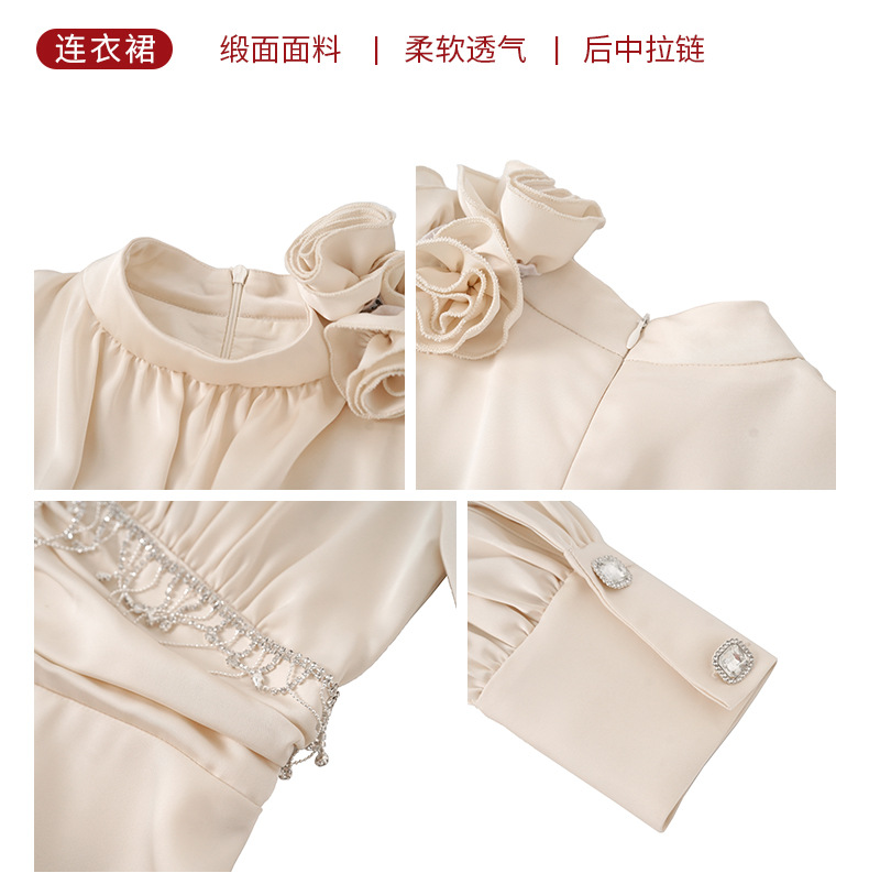 C-3053# 2023秋装新款女装温柔风气质立体花朵收腰镶钻不规则连衣裙50615