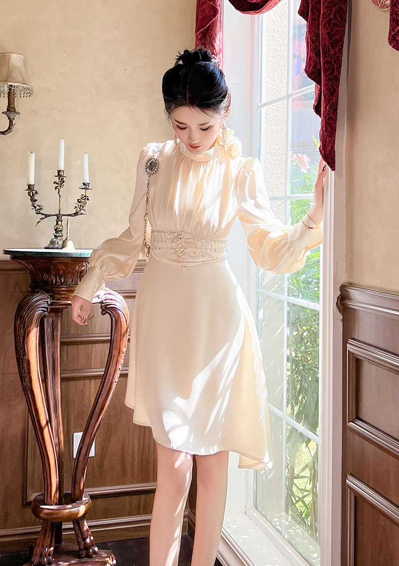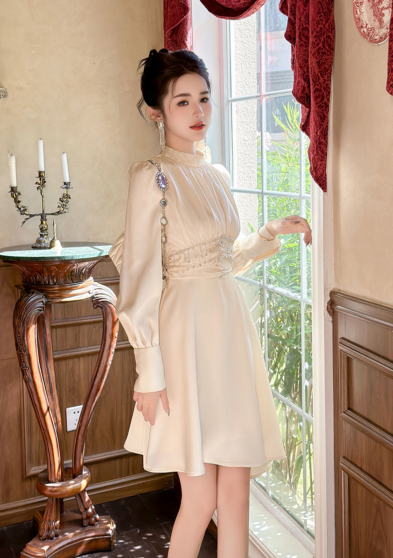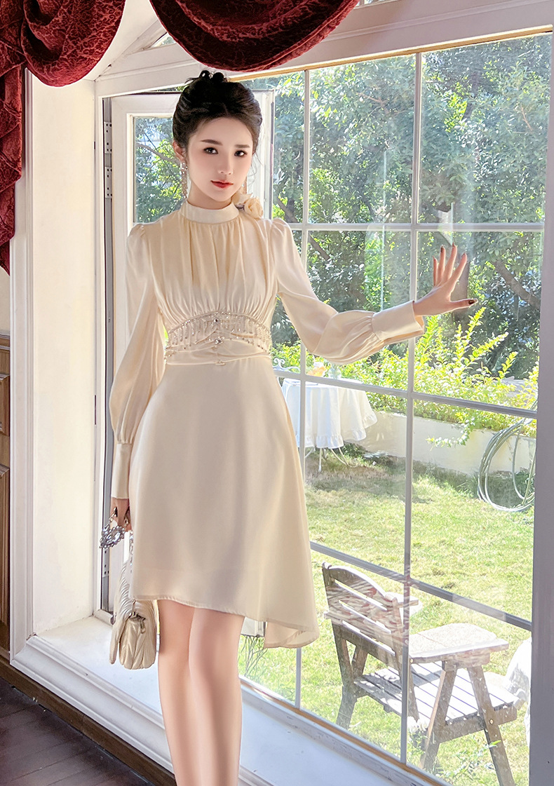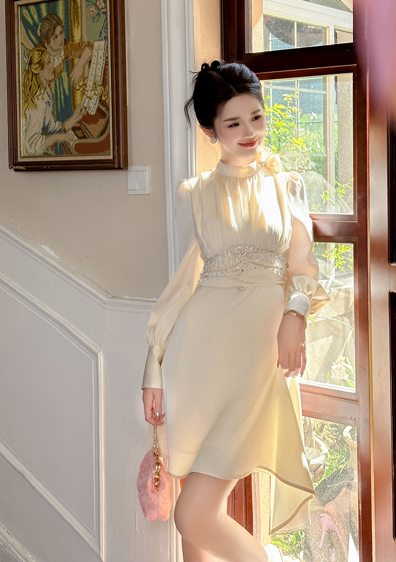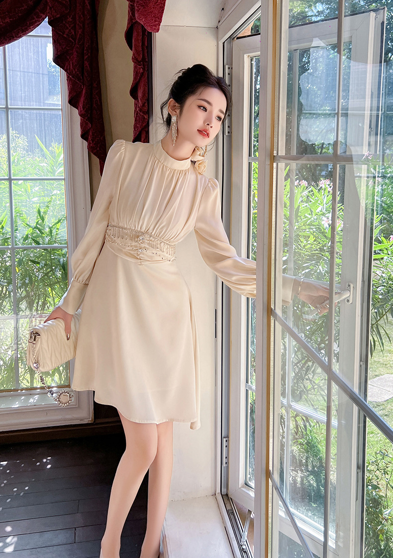 C-3053# 2023秋装新款女装温柔风气质立体花朵收腰镶钻不规则连衣裙50615