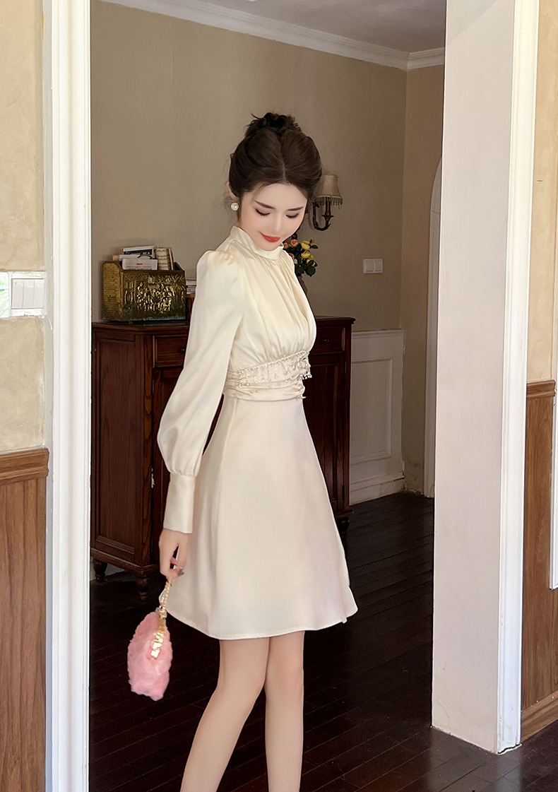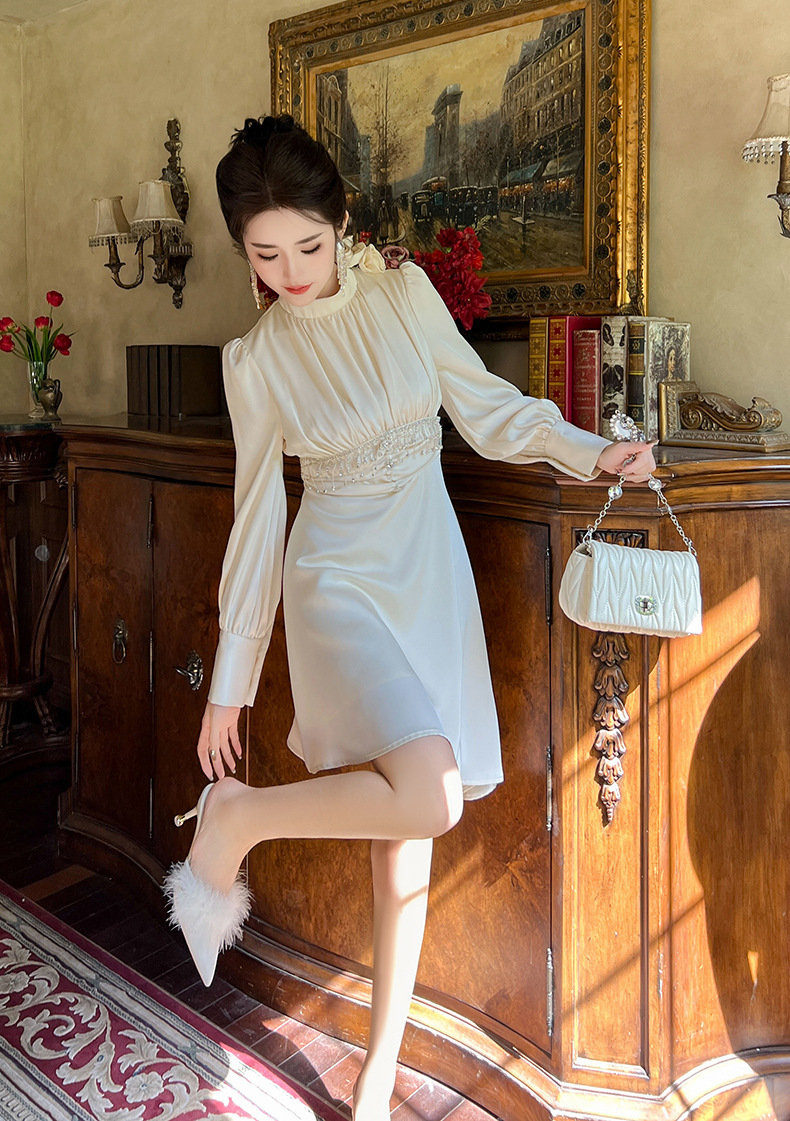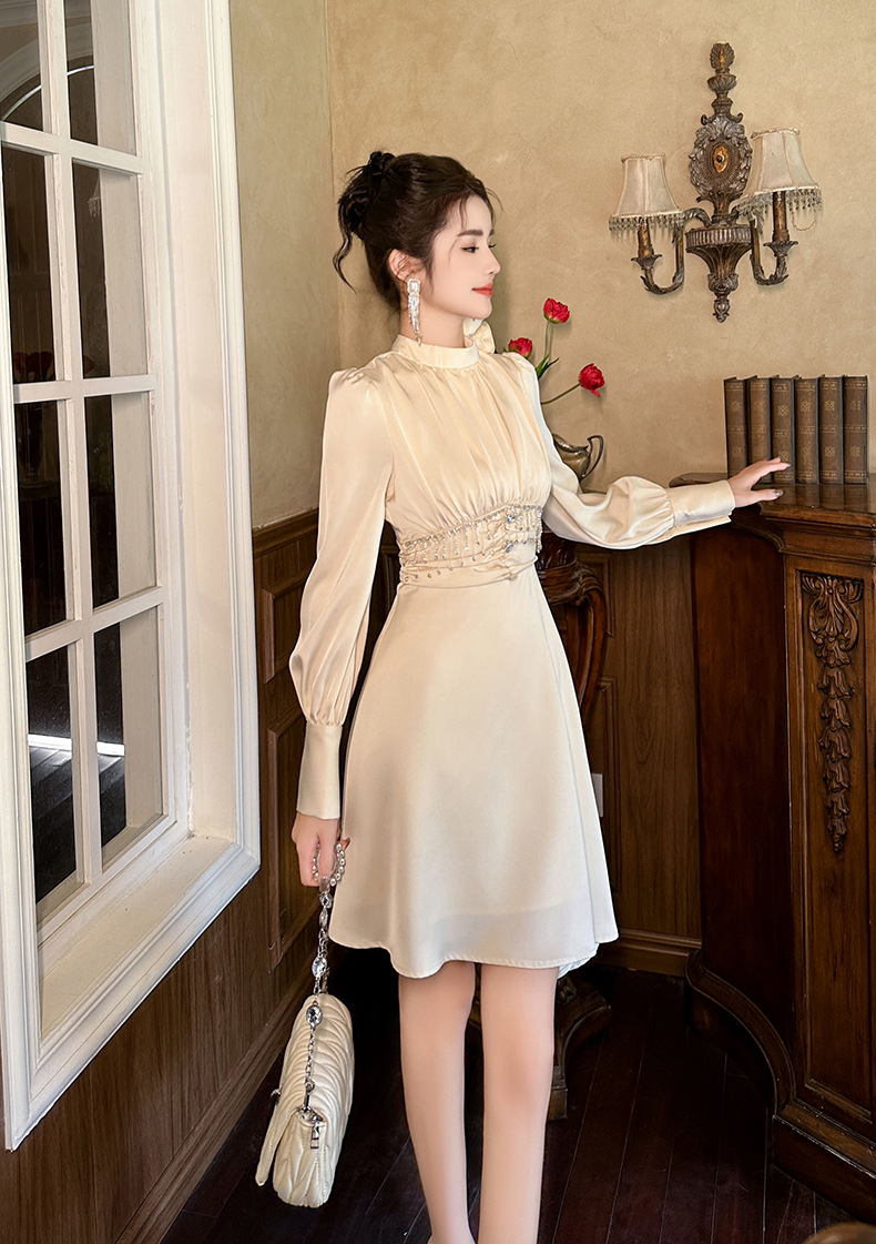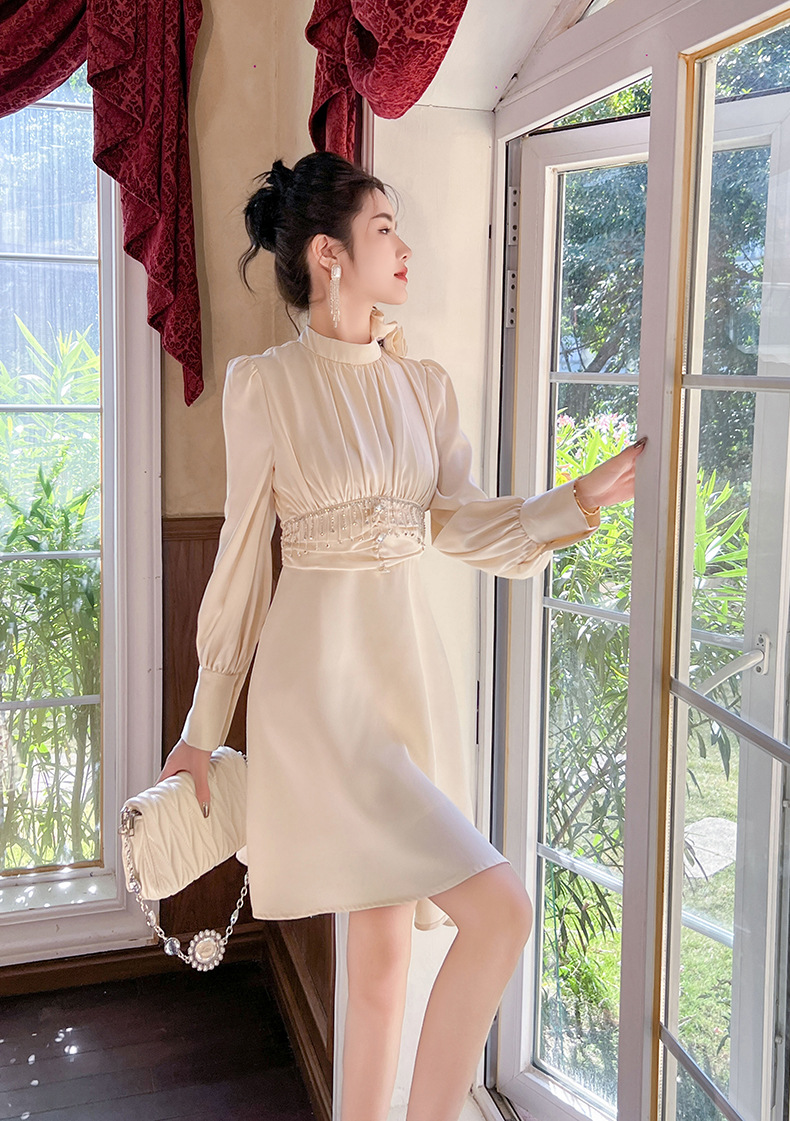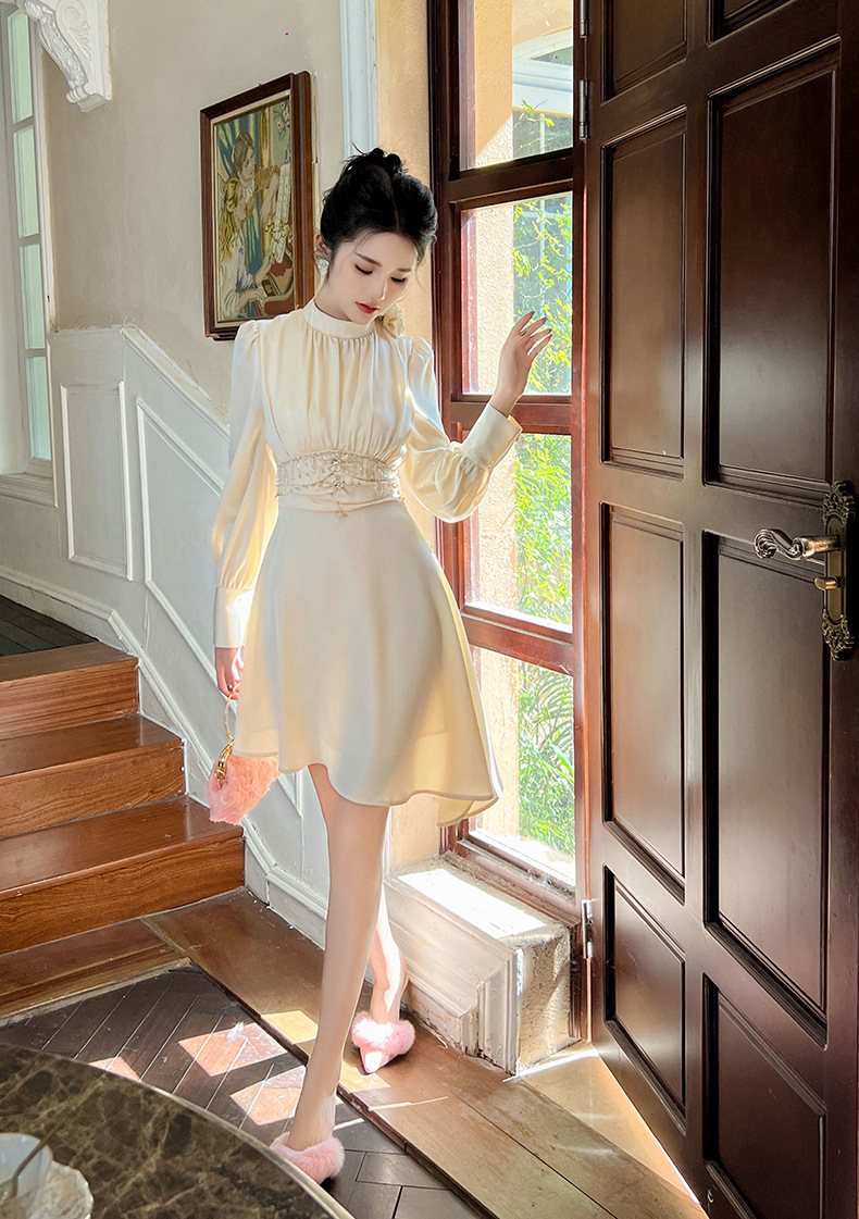 C-3053# 2023秋装新款女装温柔风气质立体花朵收腰镶钻不规则连衣裙50615