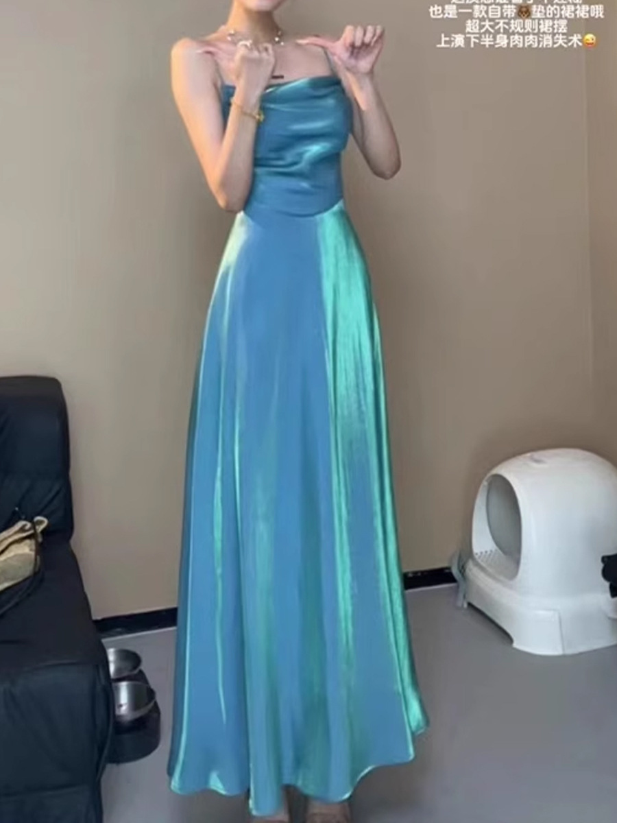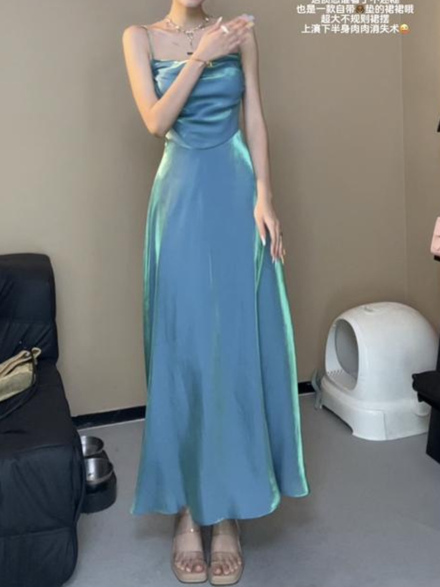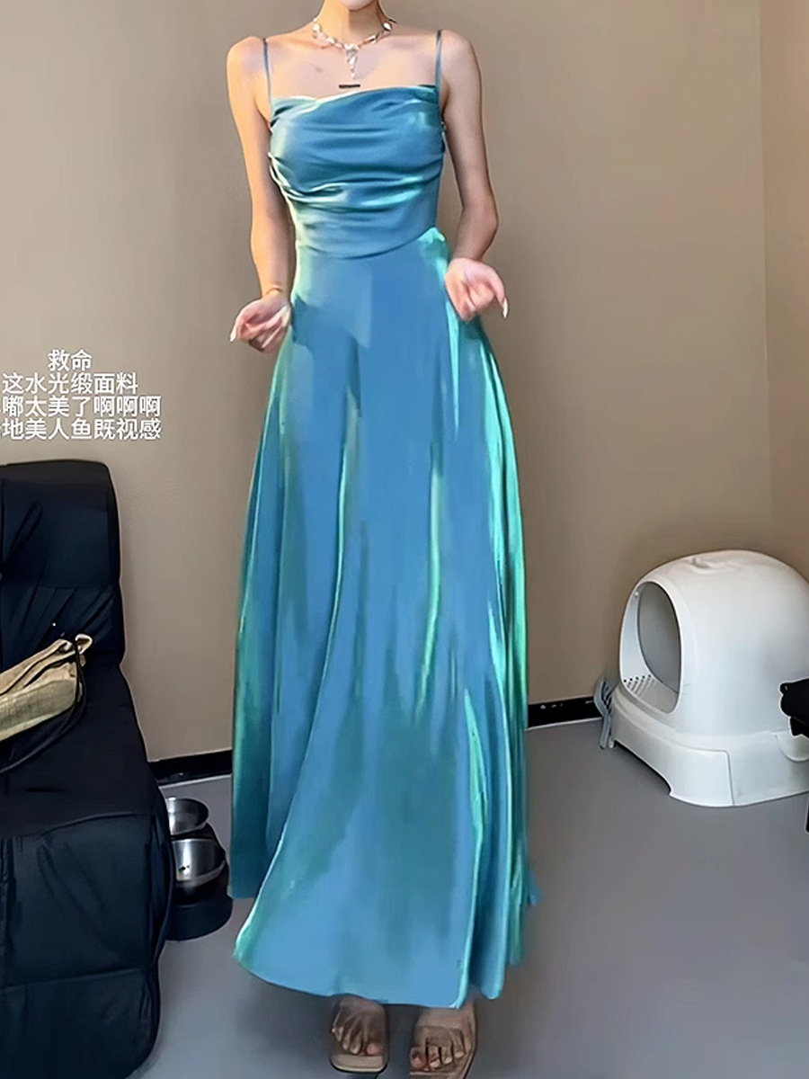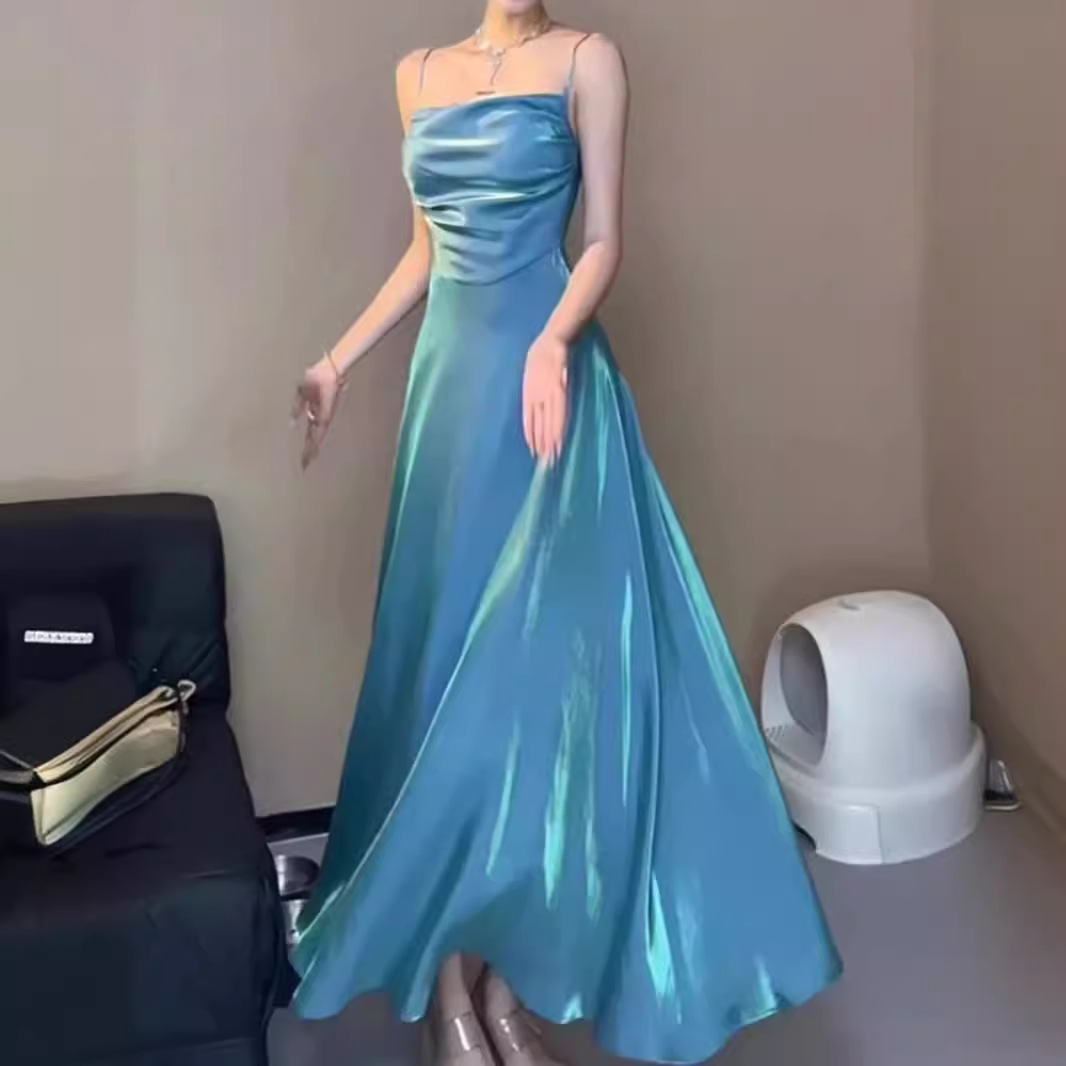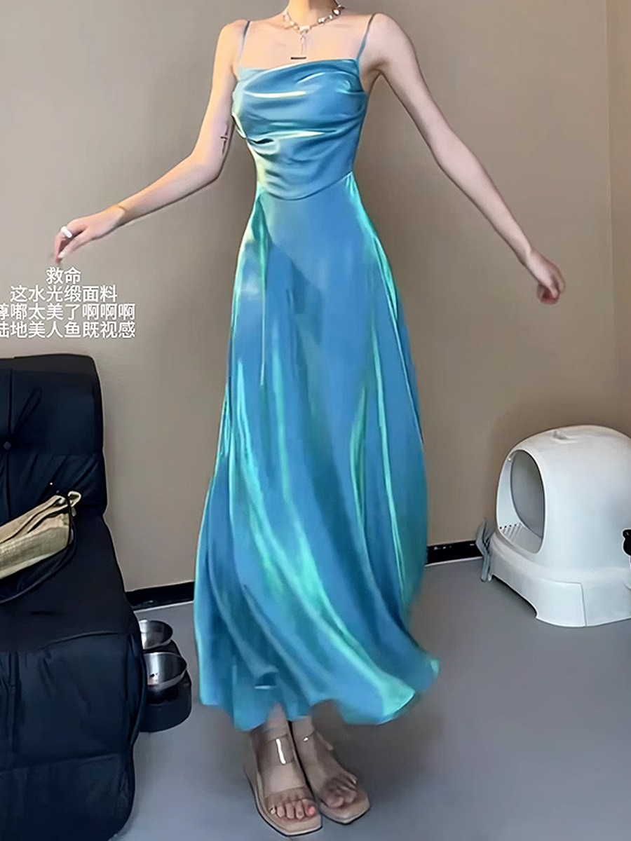 S-6522# 波光粼粼赫本风水光缎吊带连衣裙收腰气质长裙法式高级感小众裙子