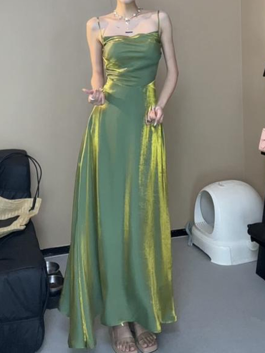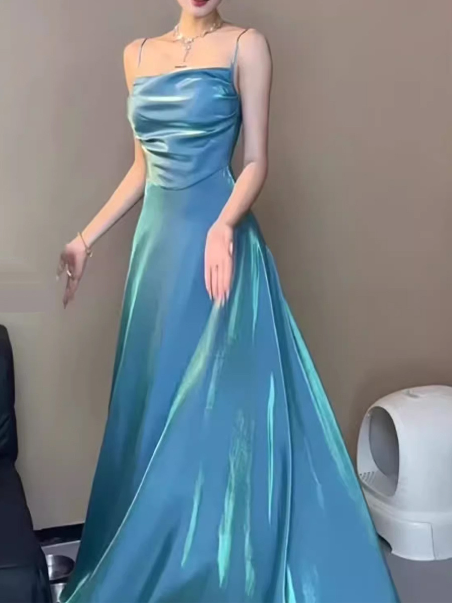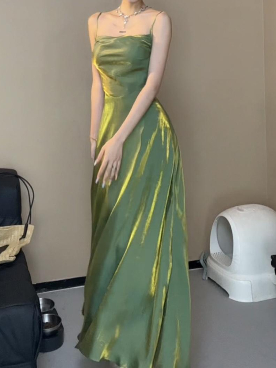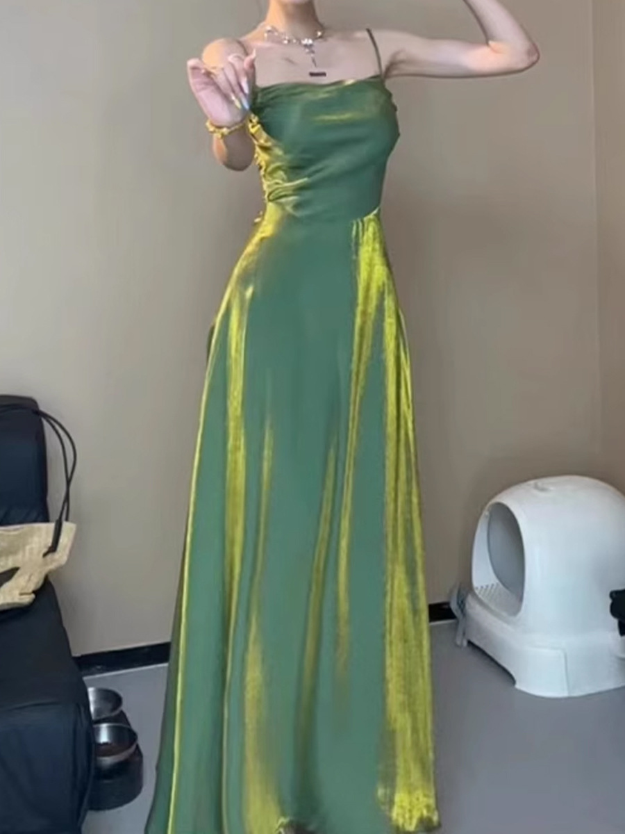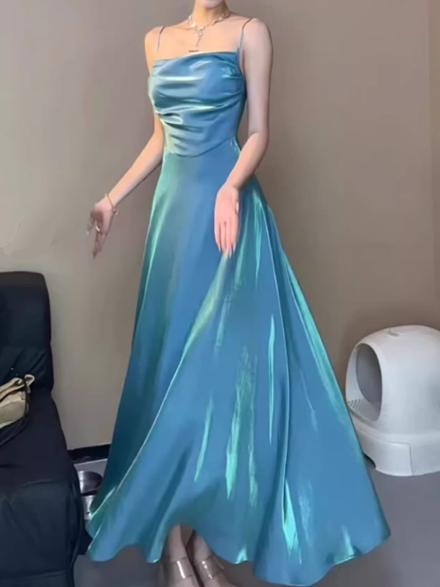S-6522# 波光粼粼赫本风水光缎吊带连衣裙收腰气质长裙法式高级感小众裙子