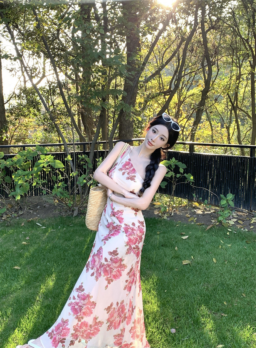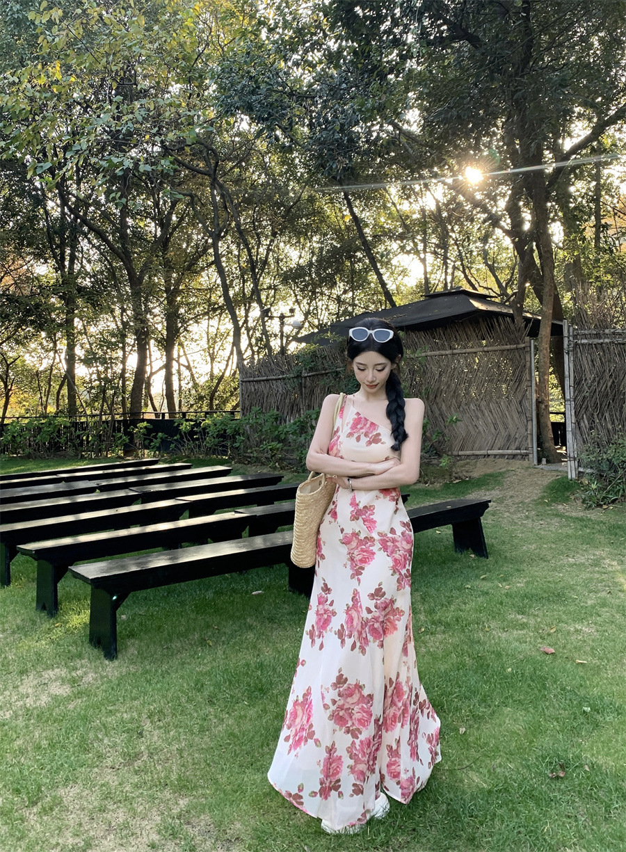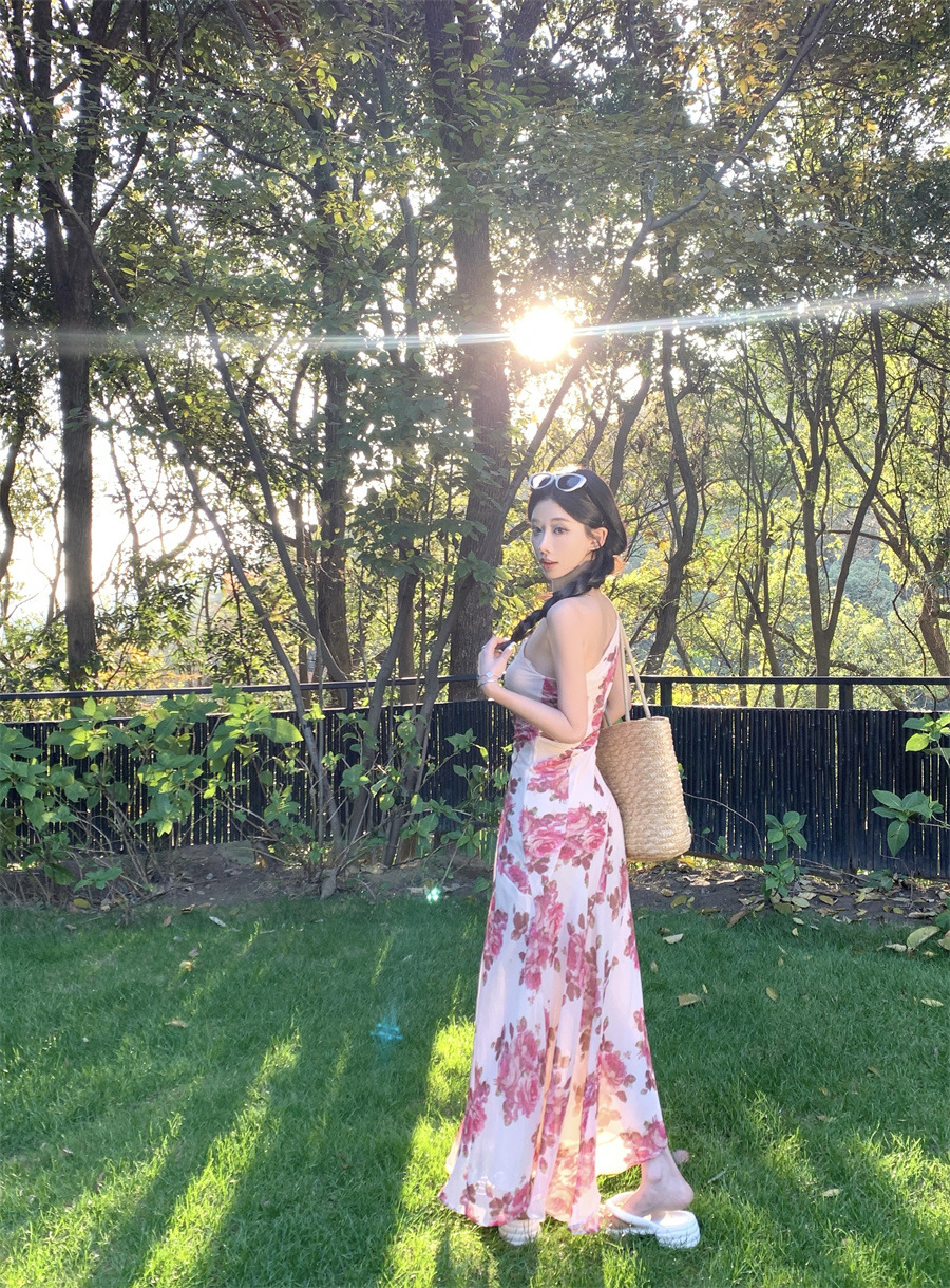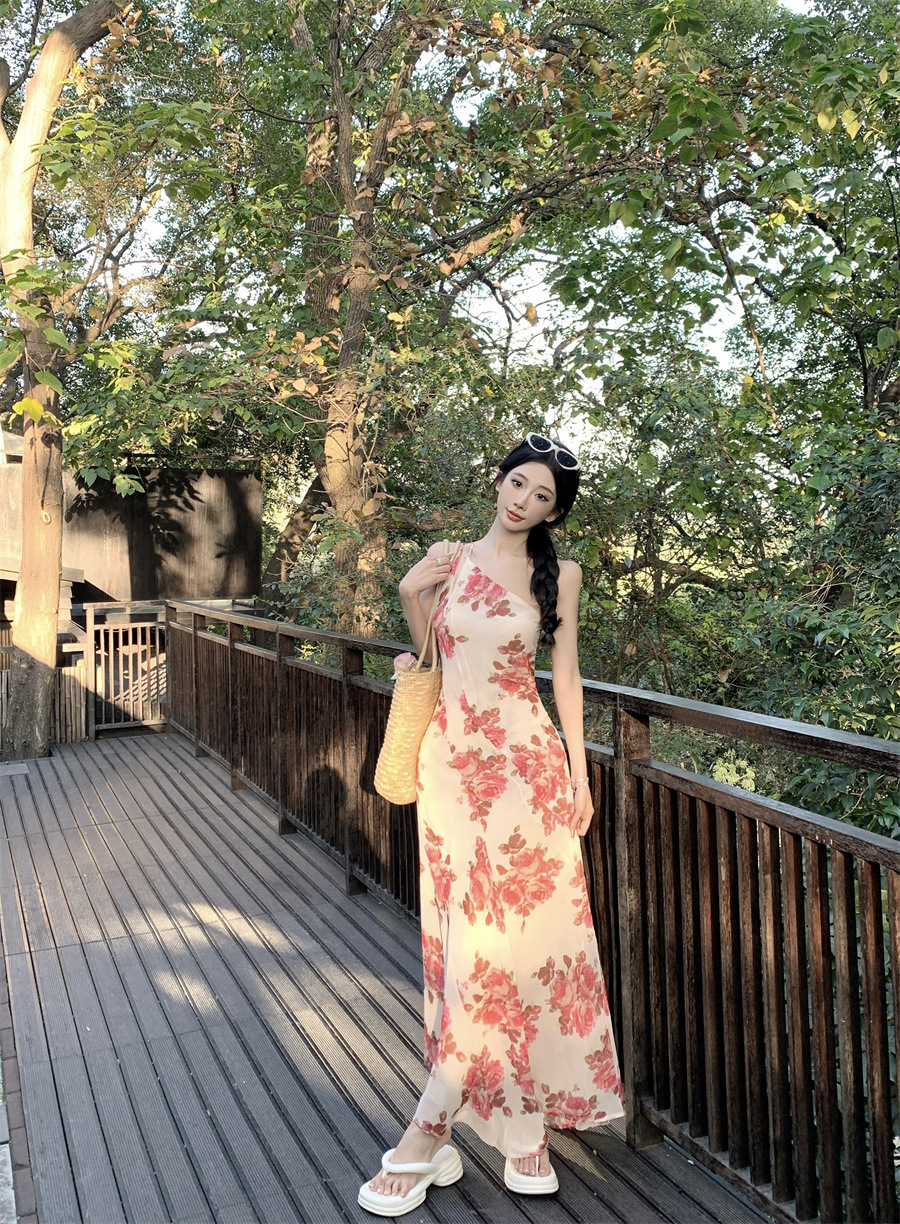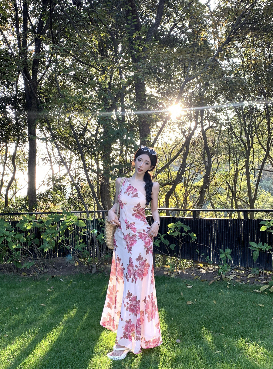 S-6998# 网红同款法式粉色碎花斜肩吊带连衣裙女夏季复古收腰度假风长裙子
