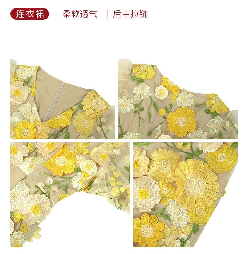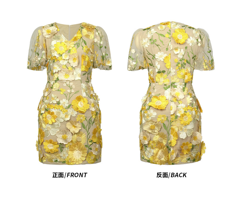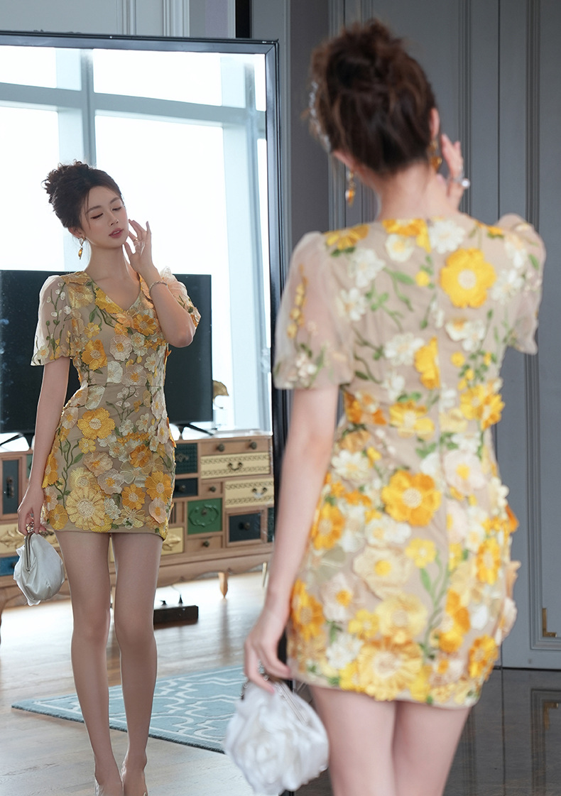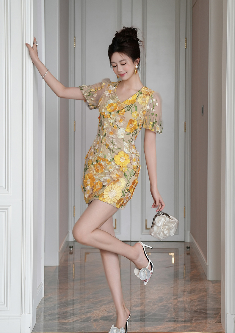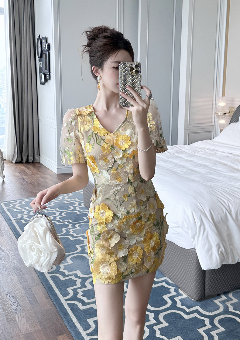 C-4016# 2025夏季新款女装法式设计感V领刺绣立体花朵修身包臀连衣裙9028