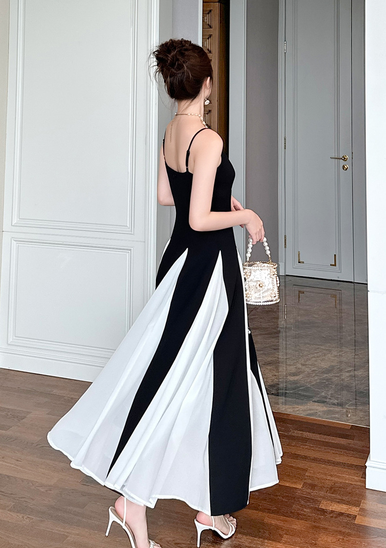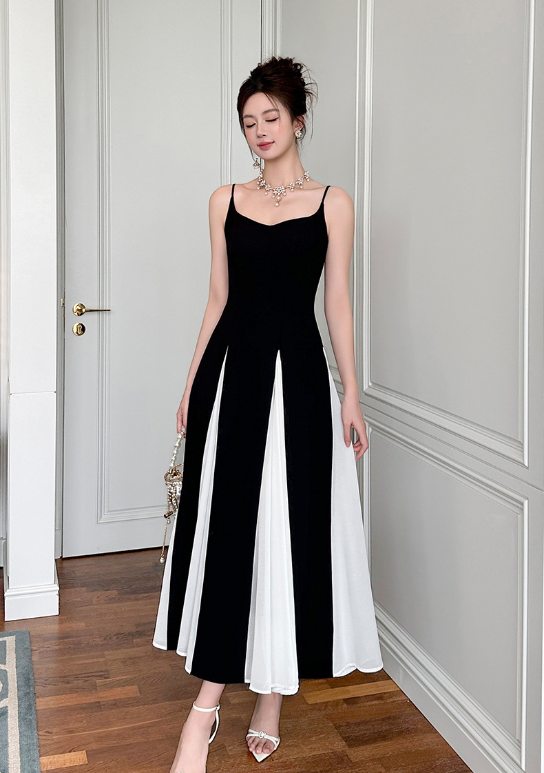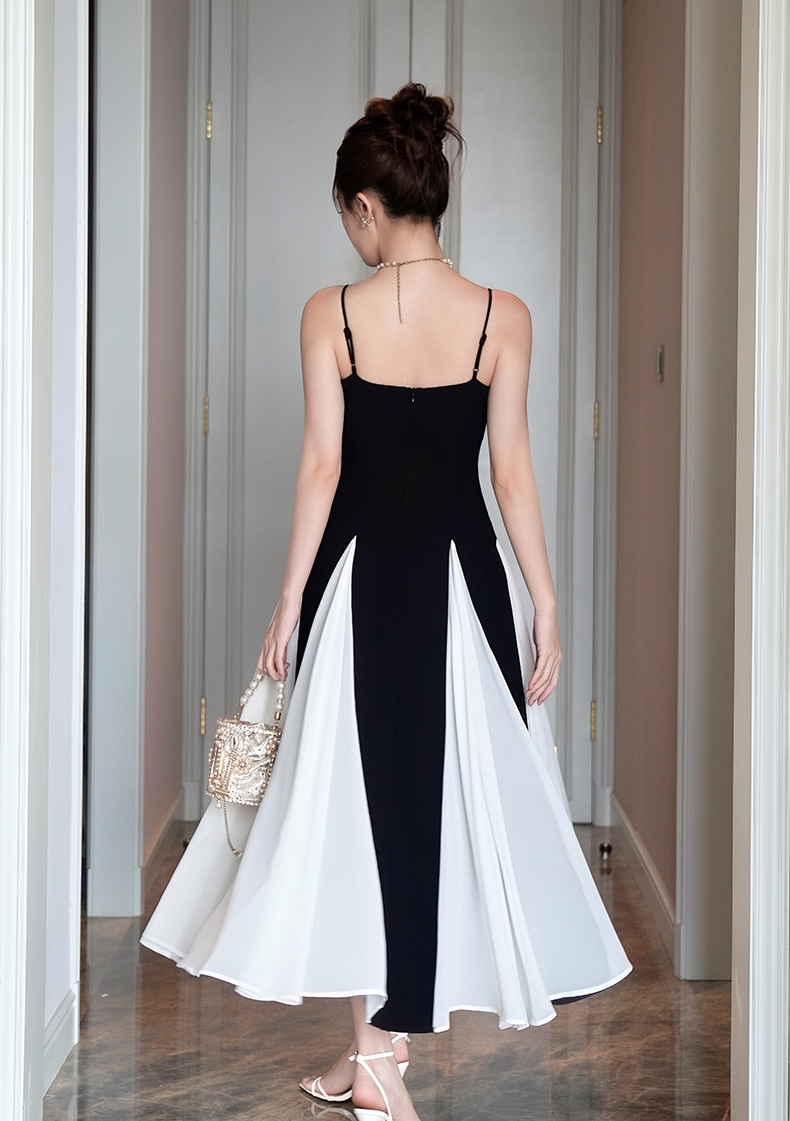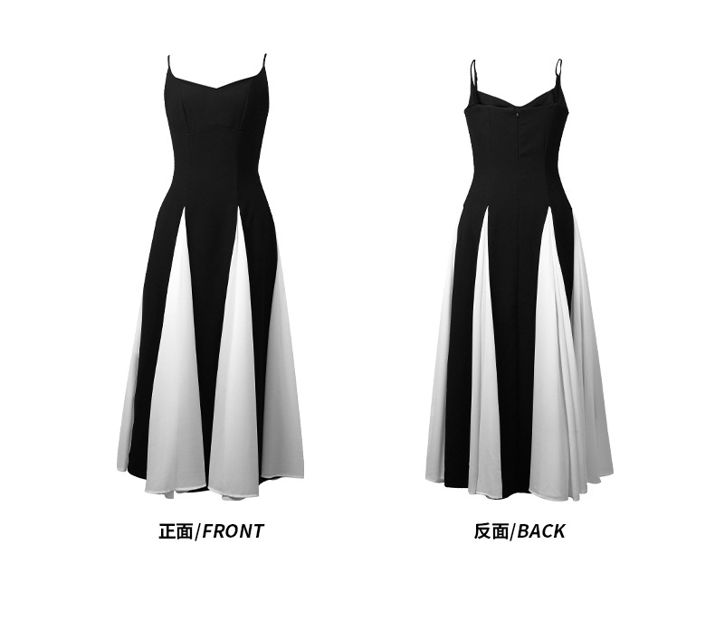C-4018# 2025夏季新款女装欧美风性感方领撞色拼接收腰大摆吊带连衣裙9790