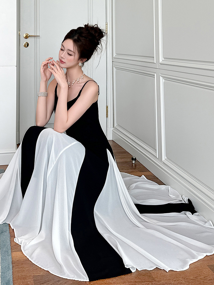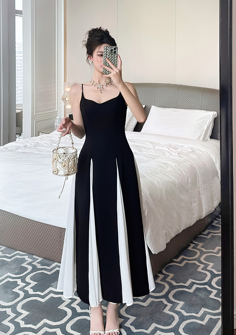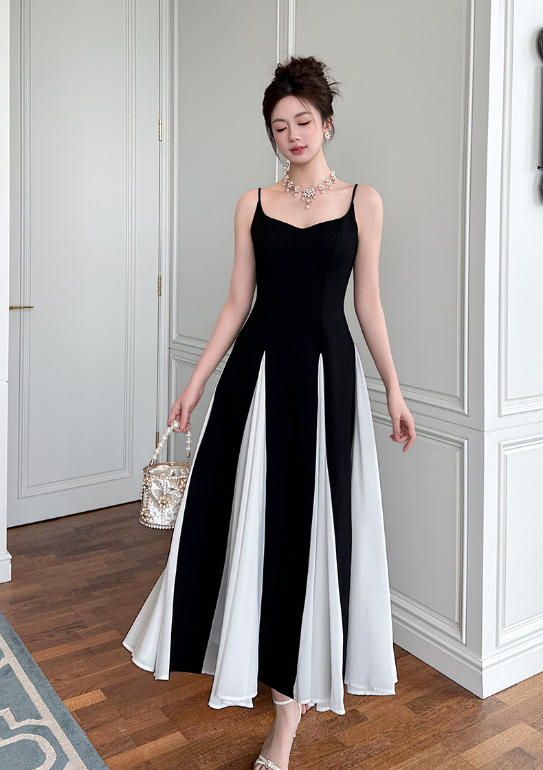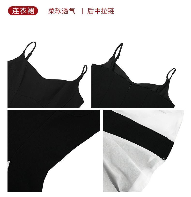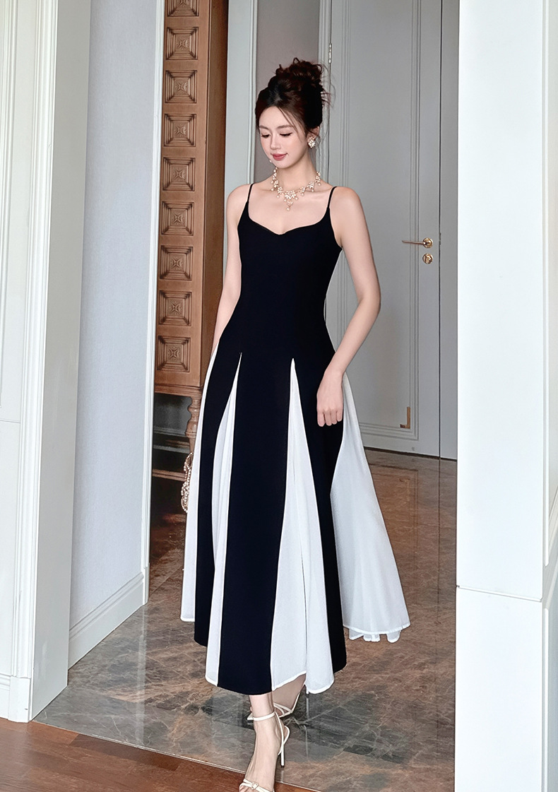 C-4018# 2025夏季新款女装欧美风性感方领撞色拼接收腰大摆吊带连衣裙9790
