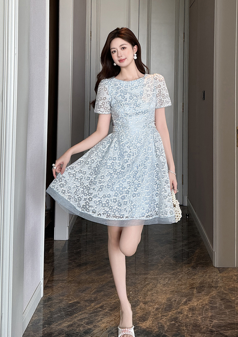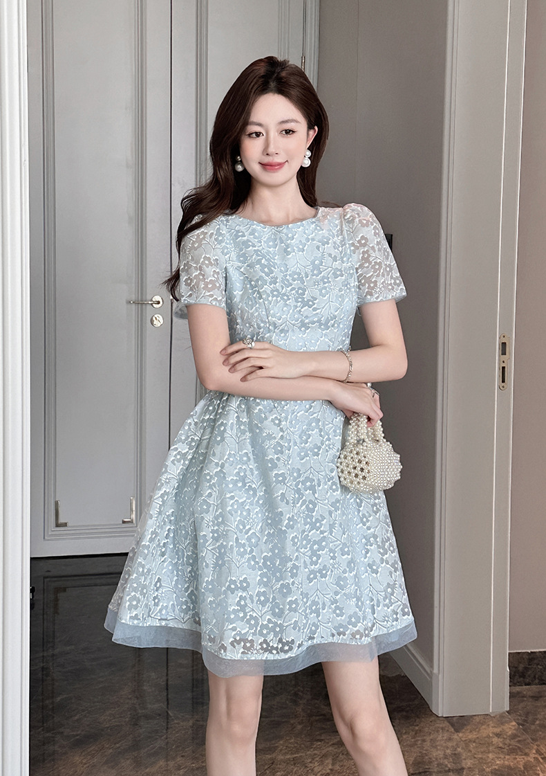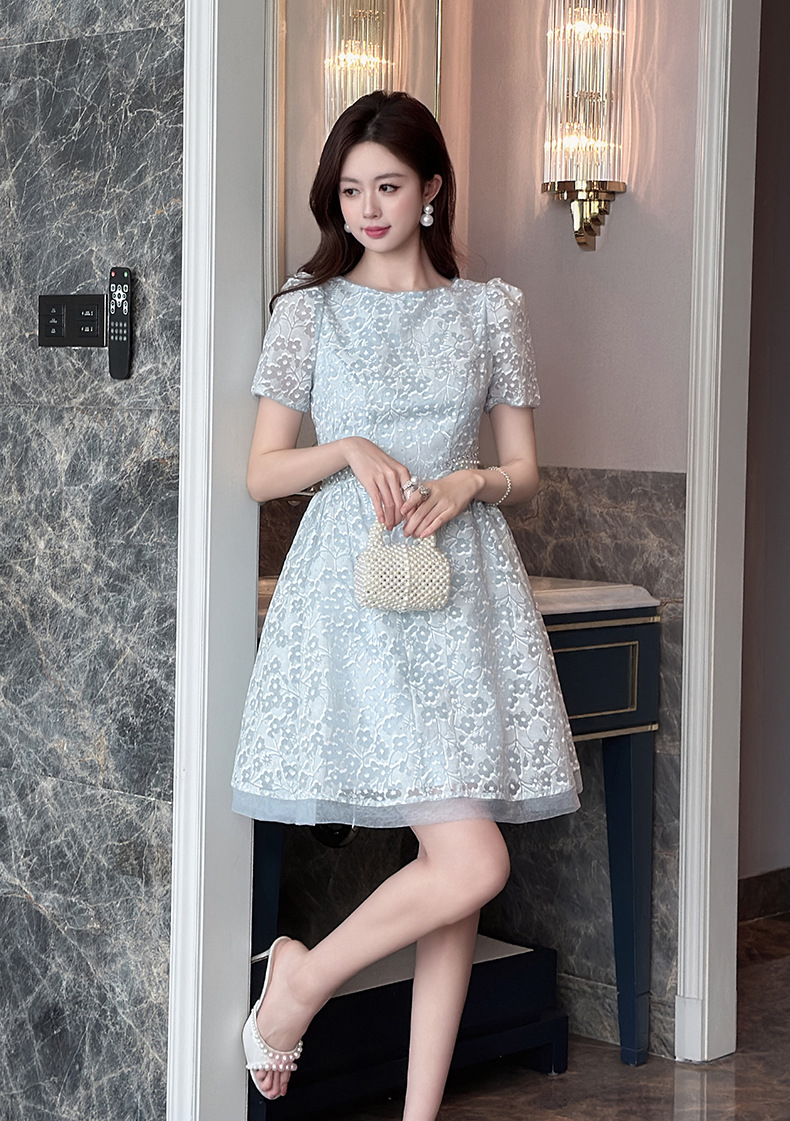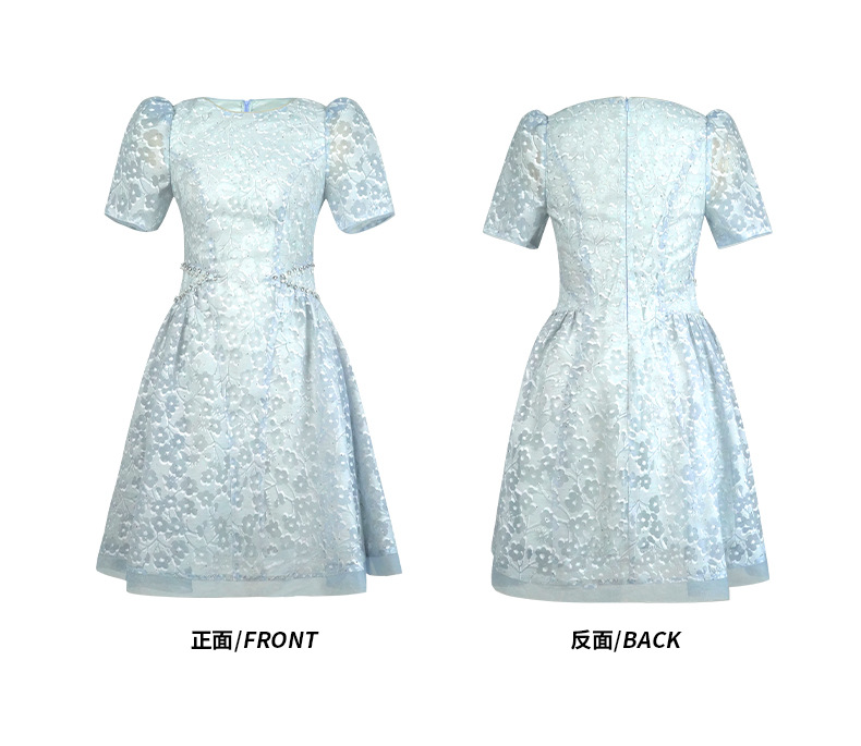 C-4025# 2025夏季新款女装法式减龄圆领泡泡袖收腰显瘦a字蕾丝连衣裙45224