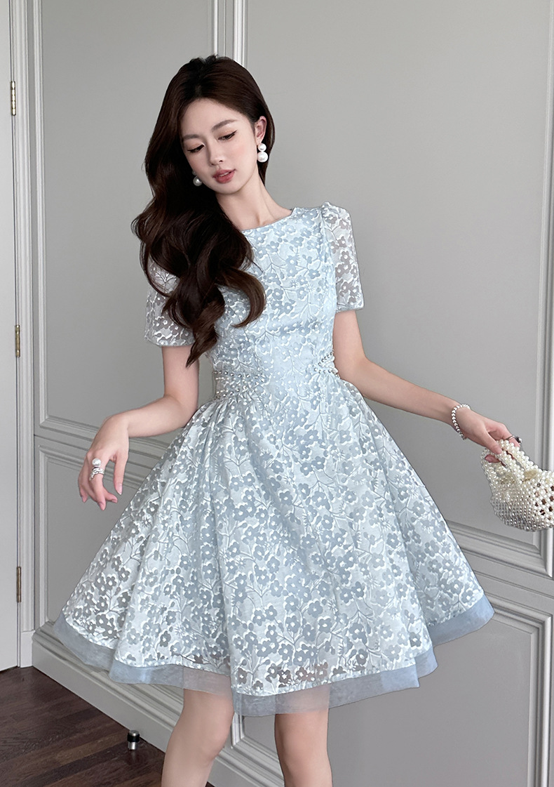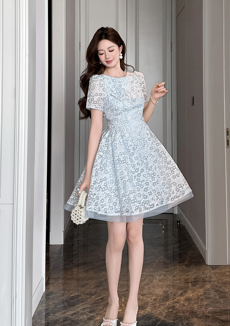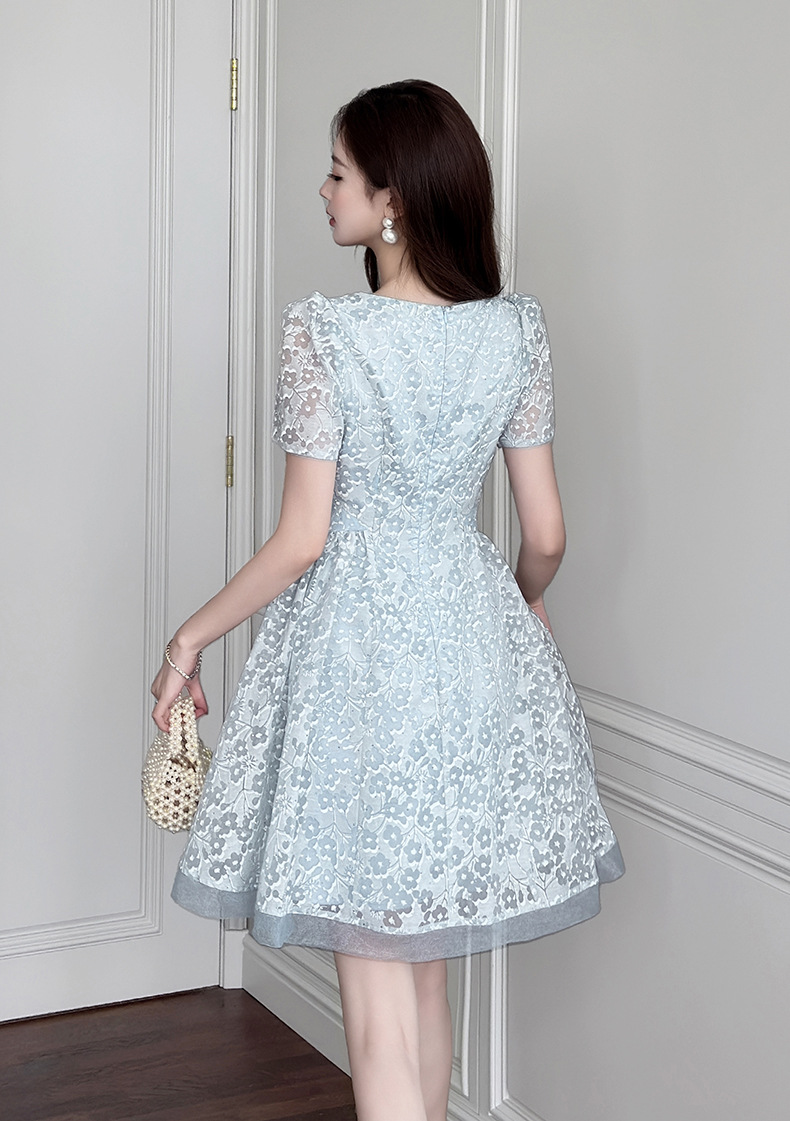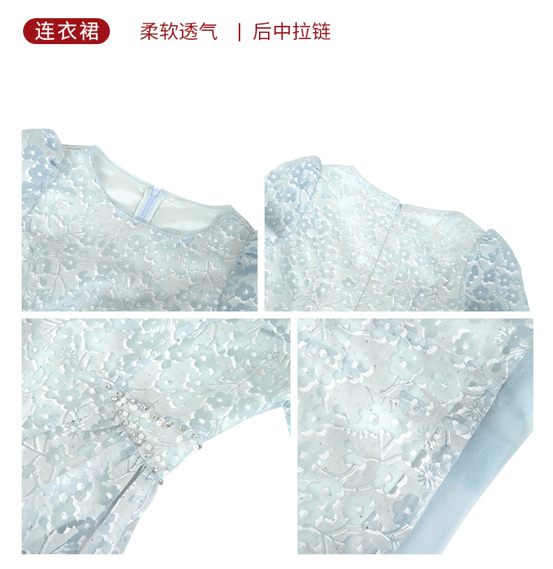 C-4025# 2025夏季新款女装法式减龄圆领泡泡袖收腰显瘦a字蕾丝连衣裙45224