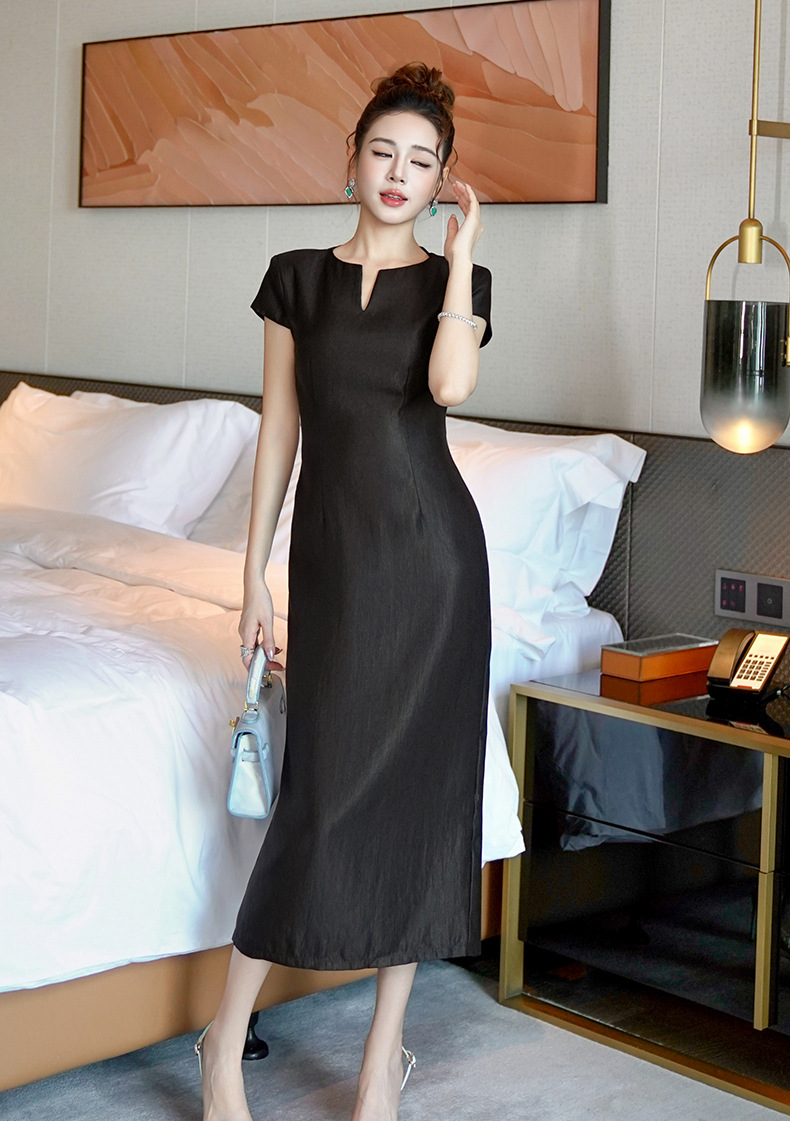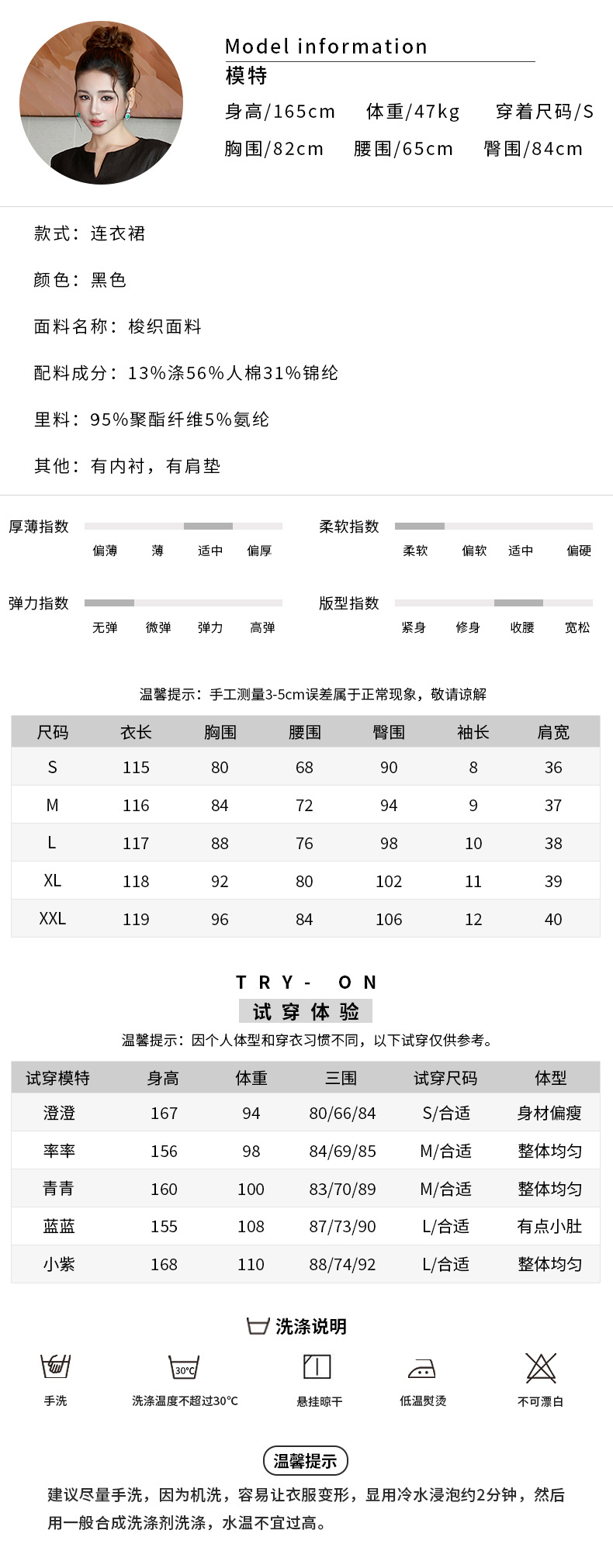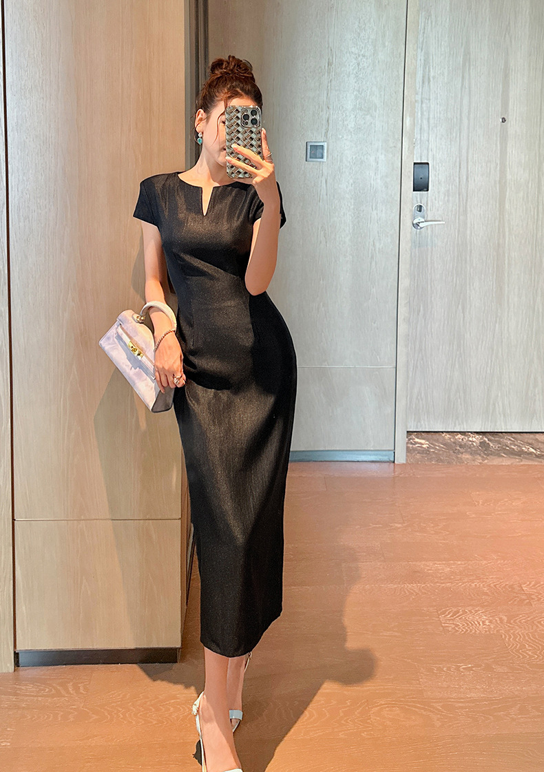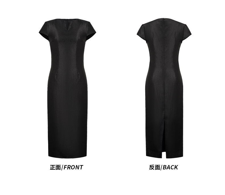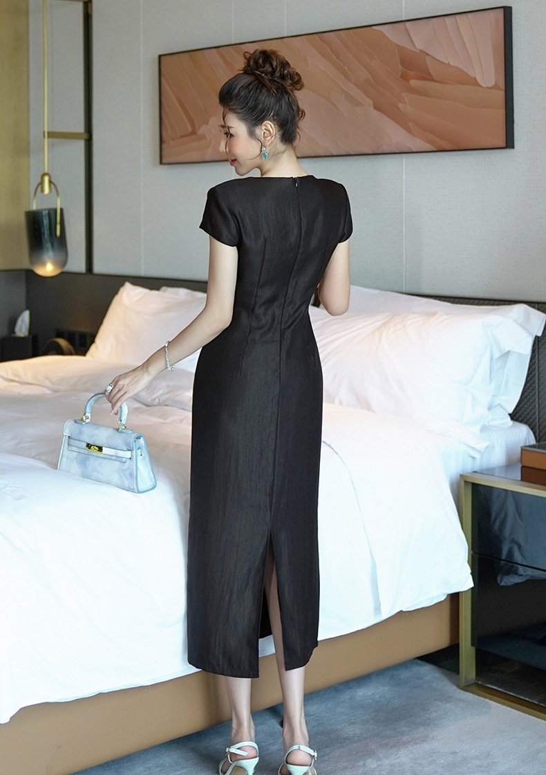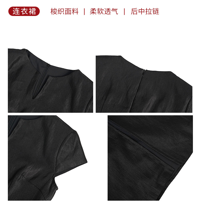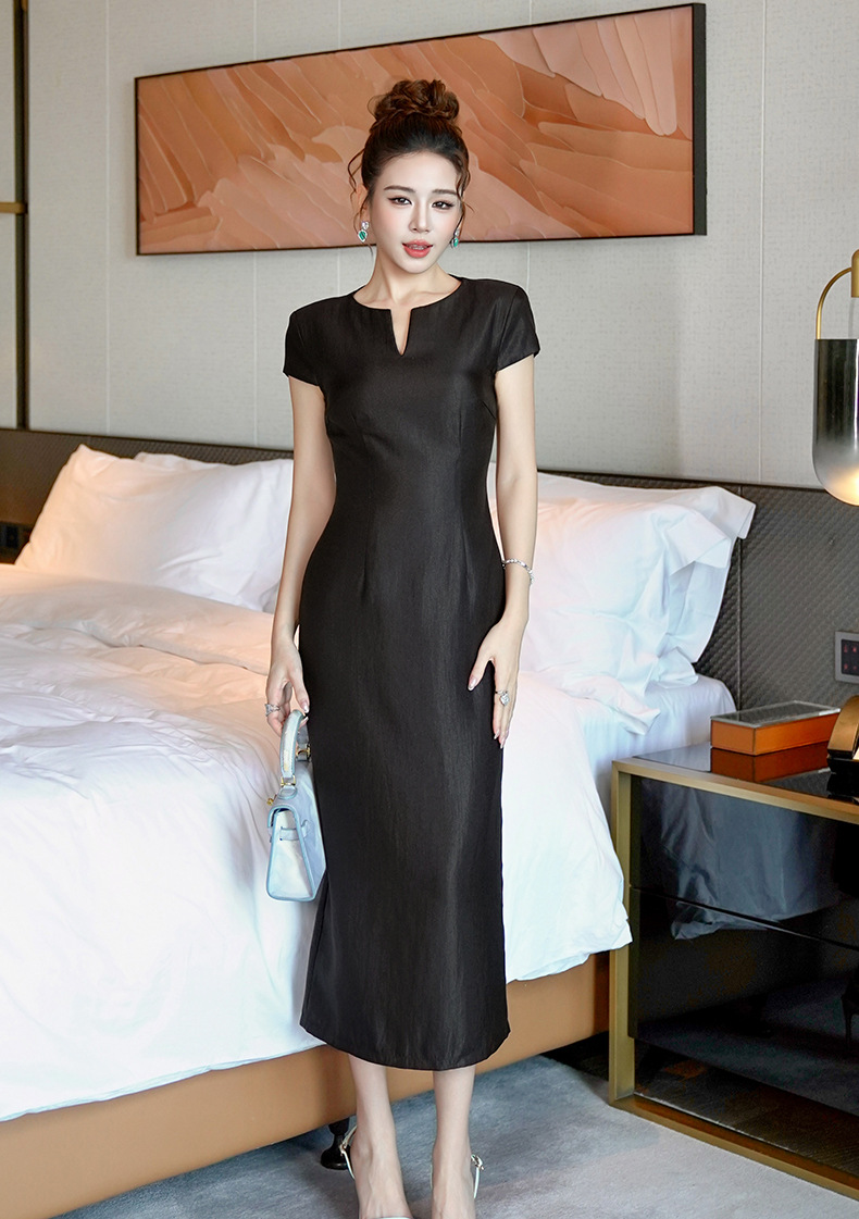 C-4399# 2025夏季新款女装法式V领收腰过膝黑色连衣裙正式场合礼服裙9041