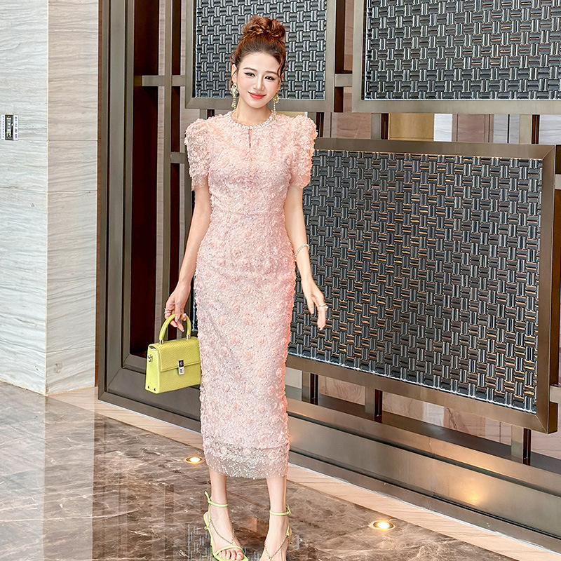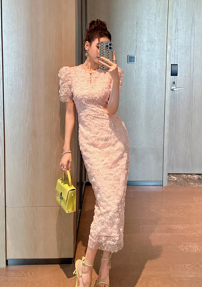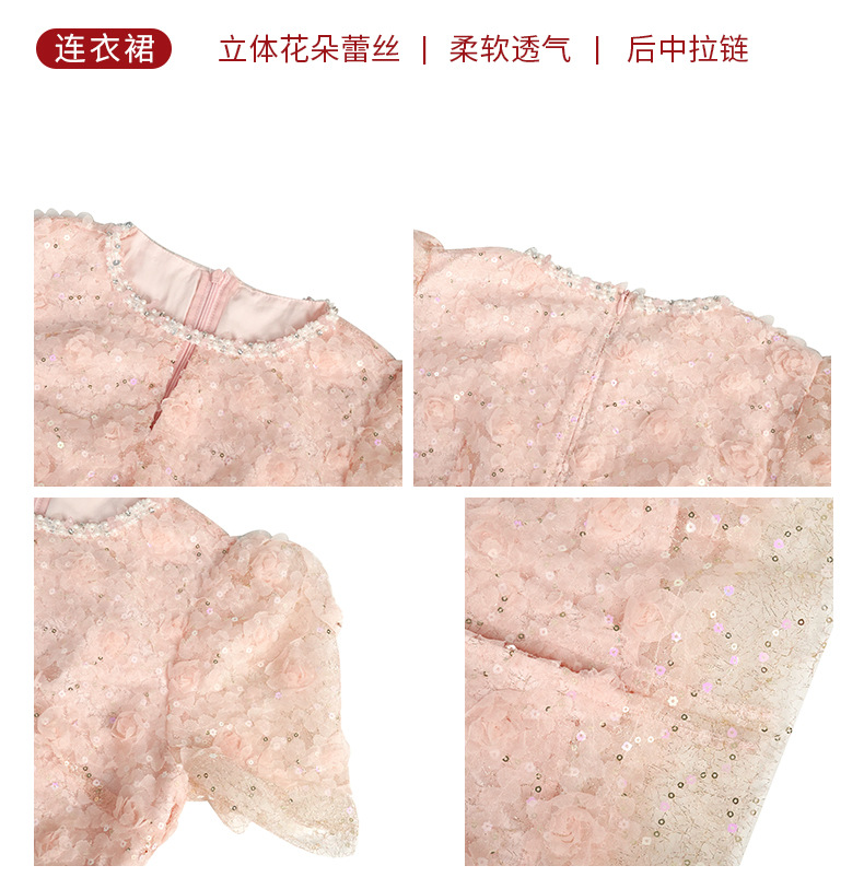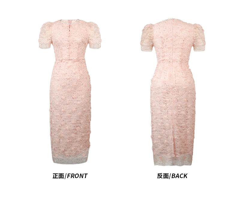 C-4405# 2025夏季新款女装甜美气质圆领镂空设计感花瓣亮片包臀连衣裙9059