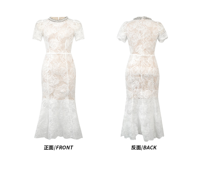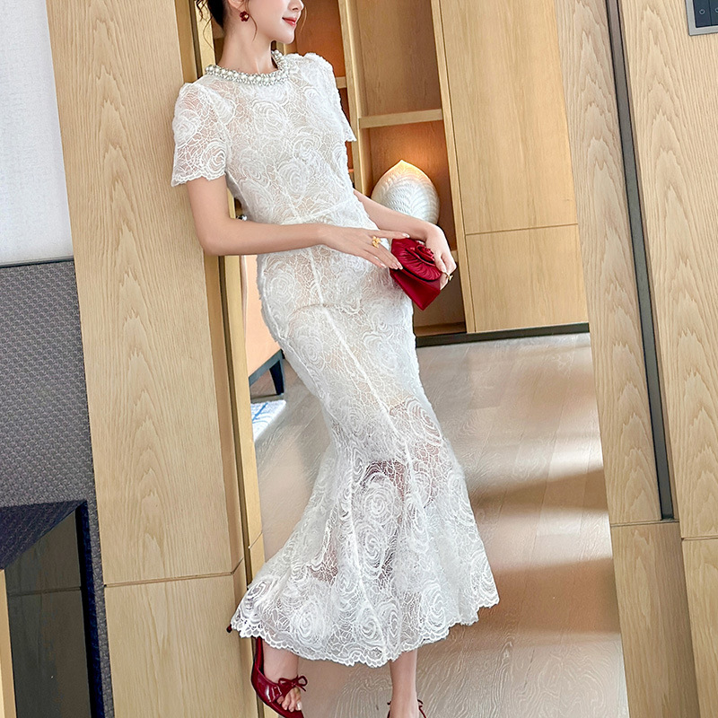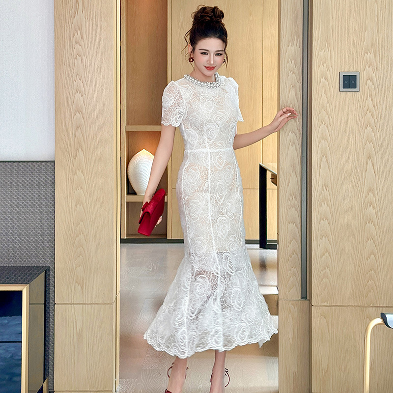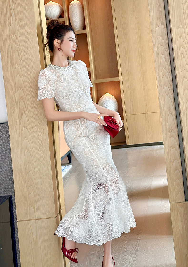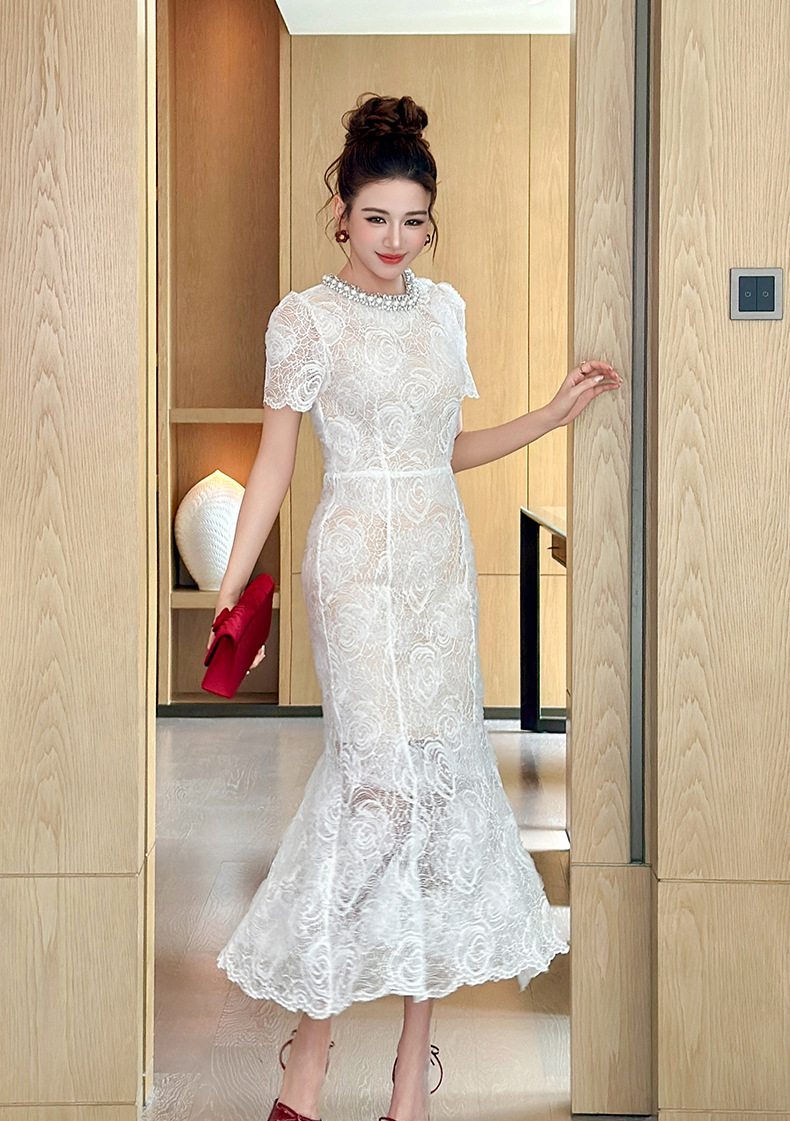 C-4418# 订婚礼服裙2025夏季新款女装法式镶钻圆领收腰鱼尾蕾丝连衣裙9081