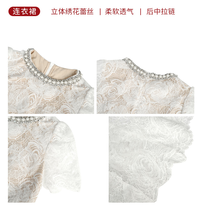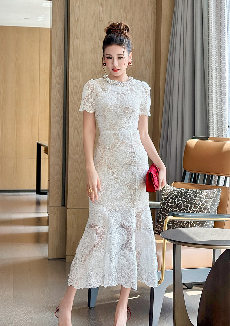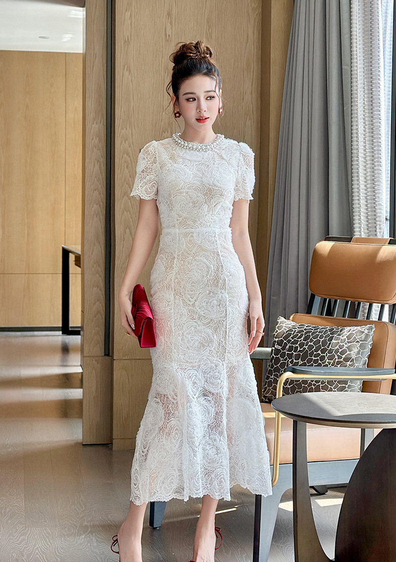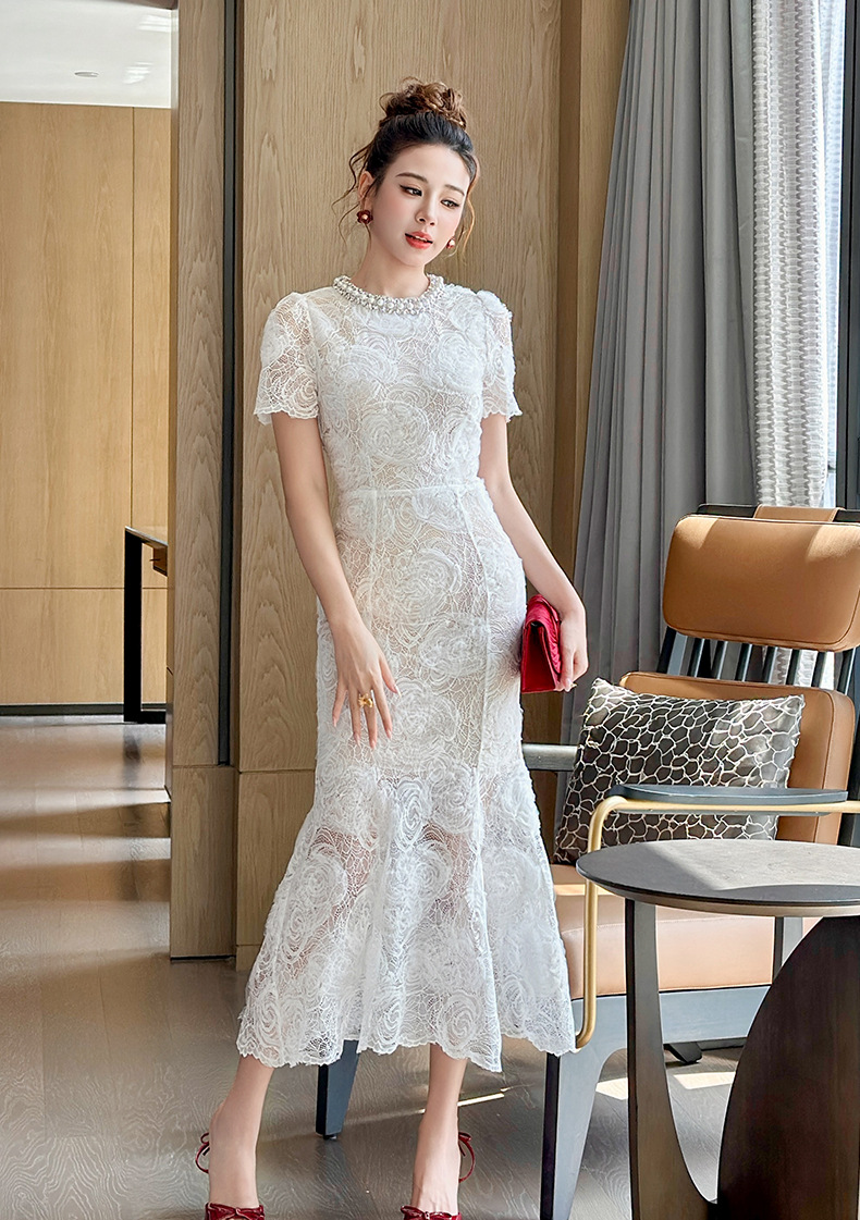 C-4418# 订婚礼服裙2025夏季新款女装法式镶钻圆领收腰鱼尾蕾丝连衣裙9081