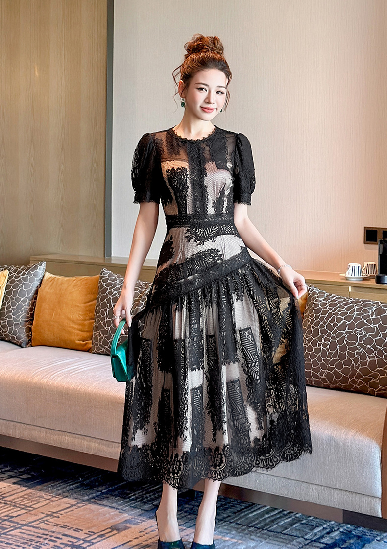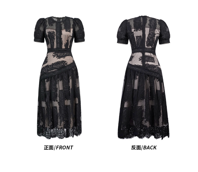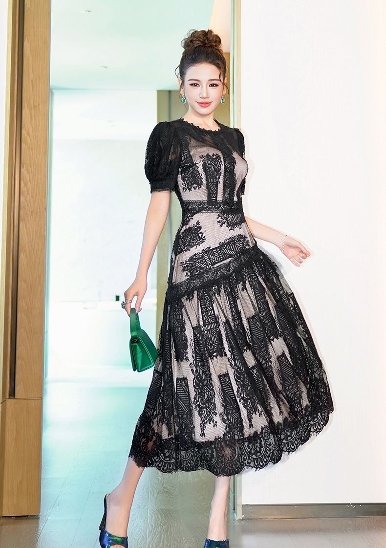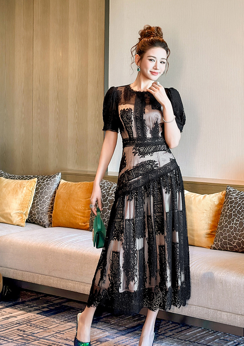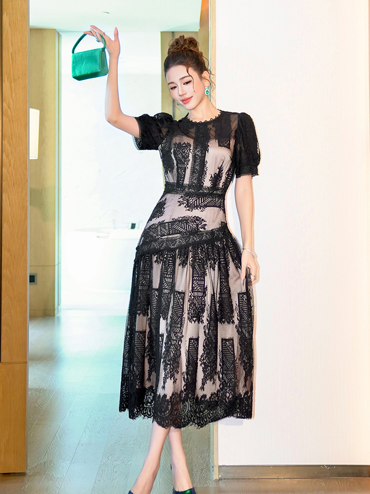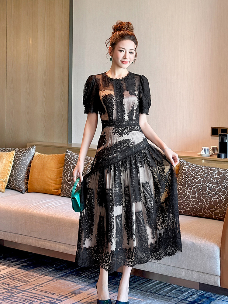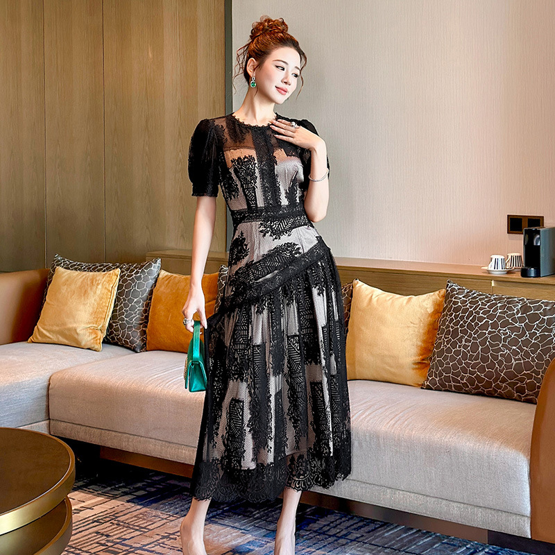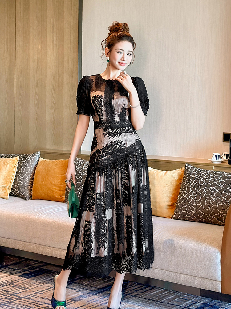 C-4421# 2205夏季新款女装优雅气质圆领收腰大摆端庄蕾丝长款连衣裙21832