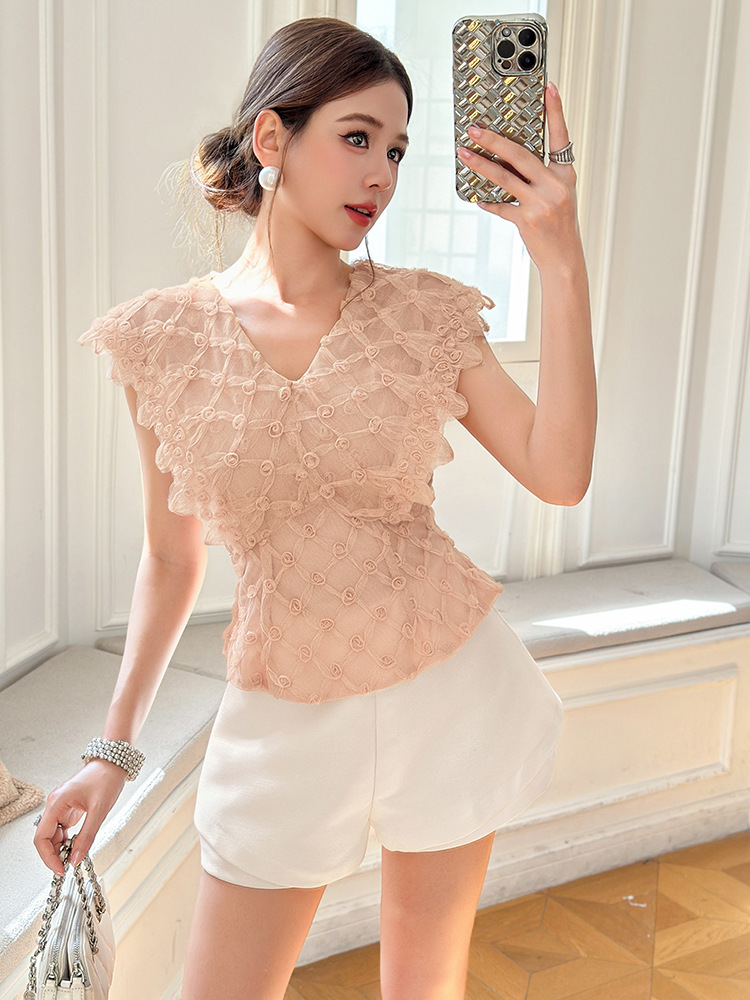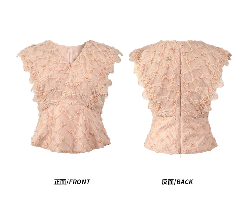 C-4494# 2025早秋新款法式V领修身收腰花朵上衣设计感别致粉色小衫女11628