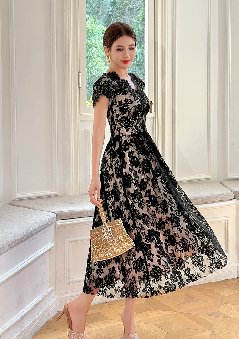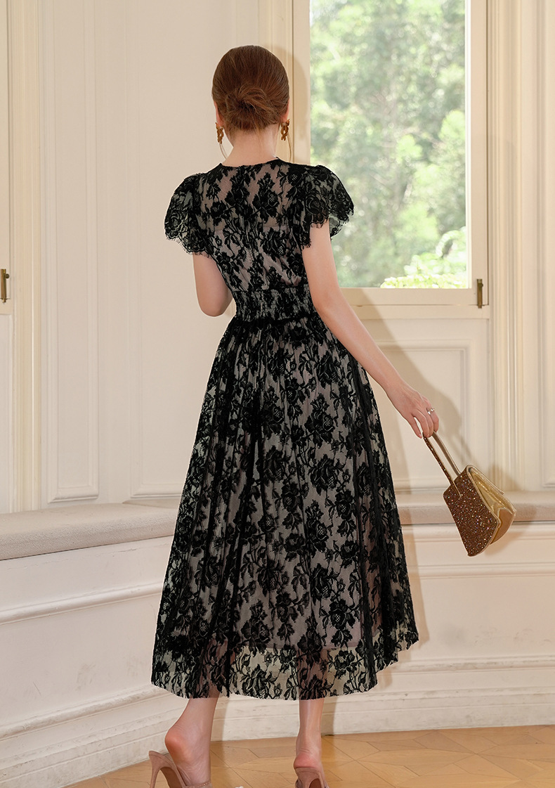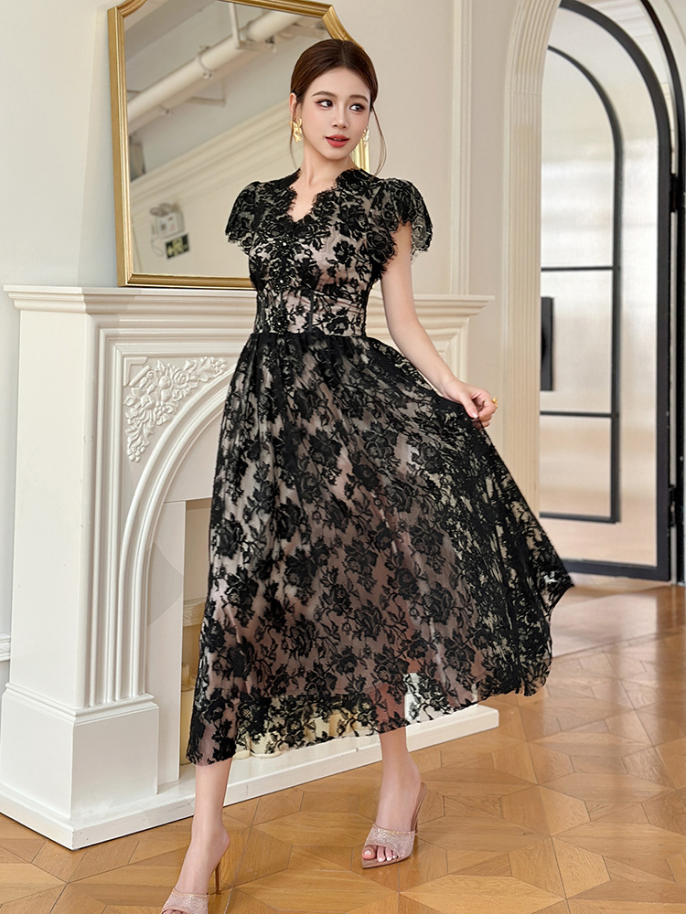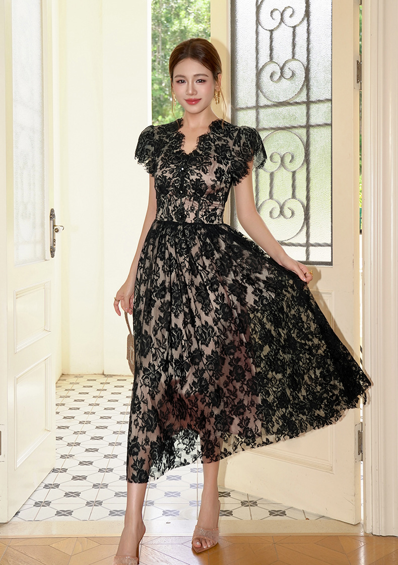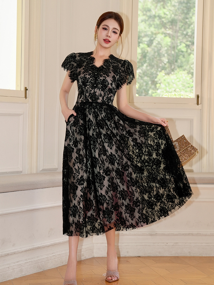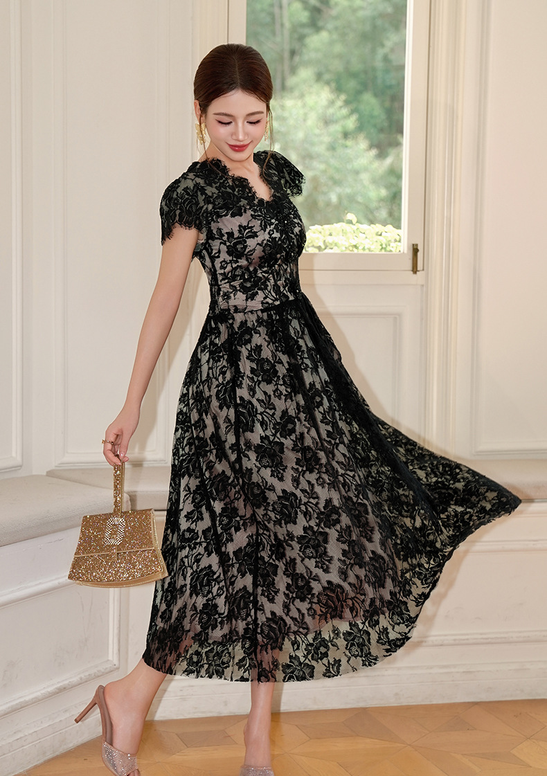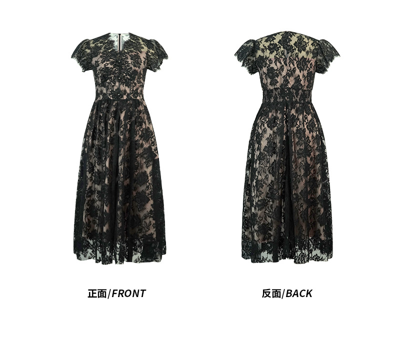C-4499# 2025早秋新款女法式V领收腰大摆蕾丝连衣裙正式场合气质裙子21686
