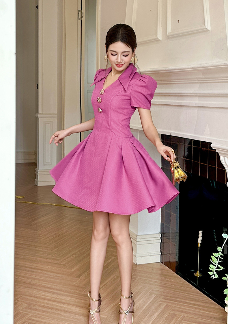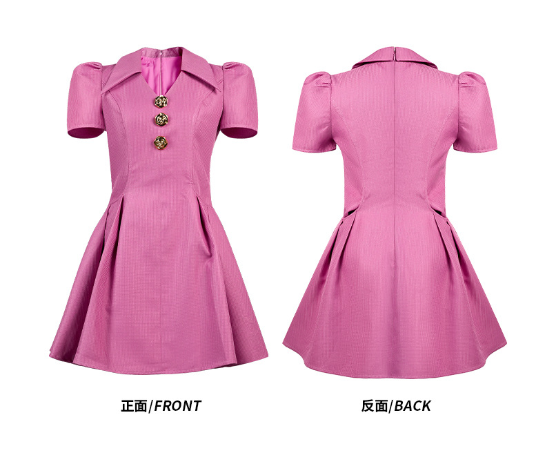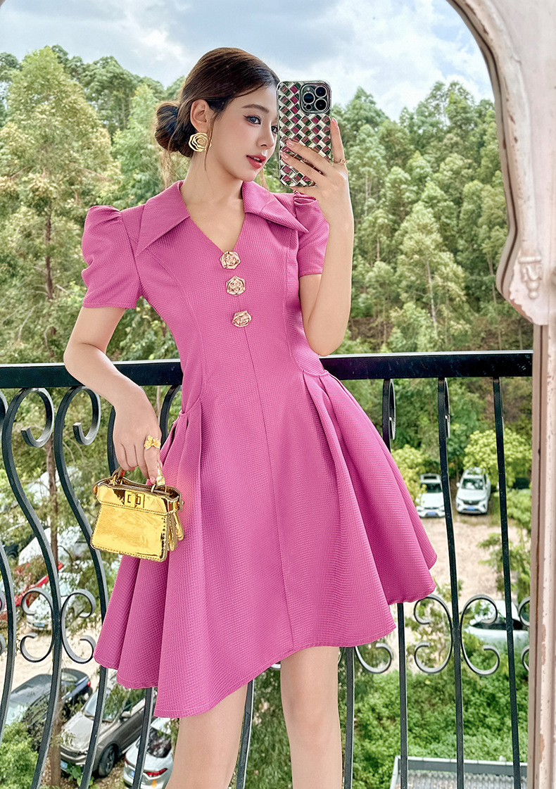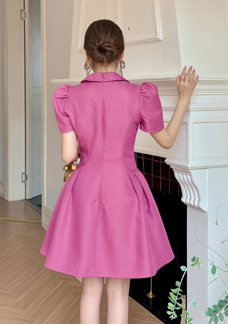 C-4500# 2025早秋新款女装法式气质翻领收腰树莓粉显白短袖连衣裙61275