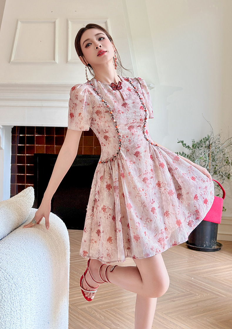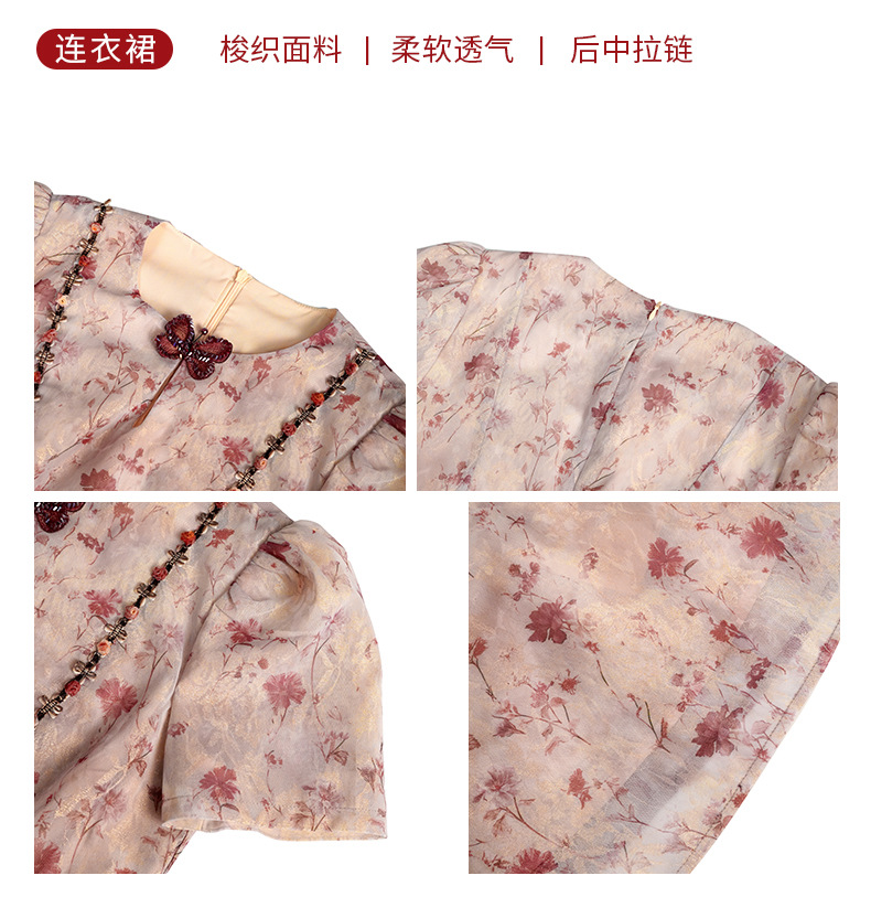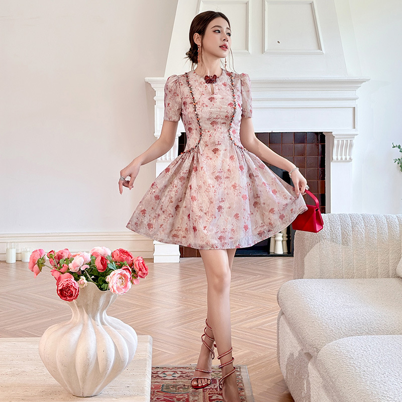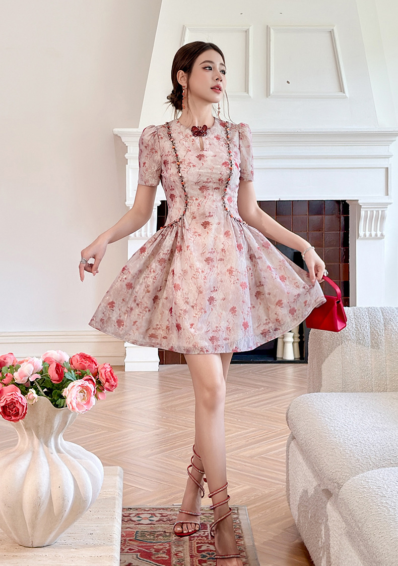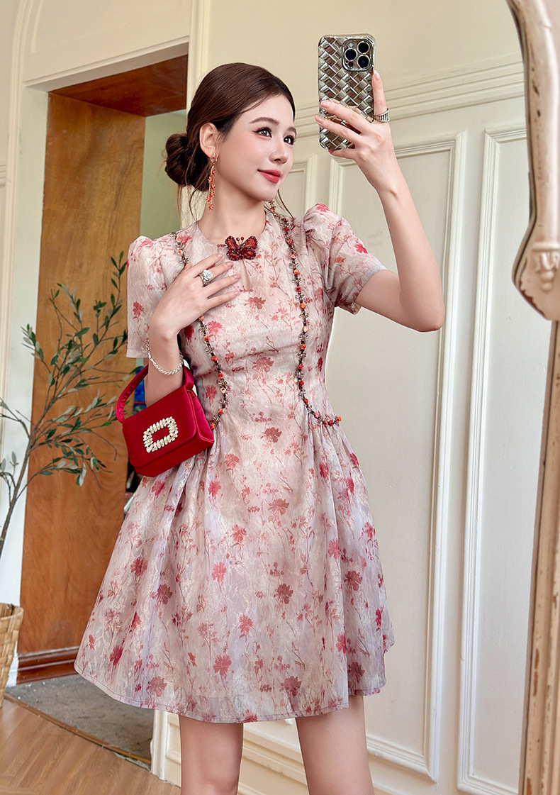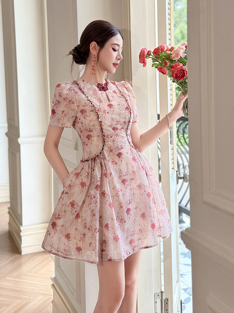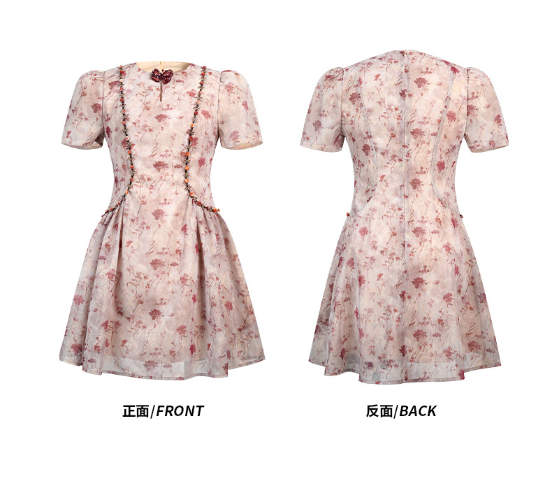C-4504# 2025早秋新款女装法式贵气圆领蝴蝶结收腰a字蓬蓬碎花连衣裙21852