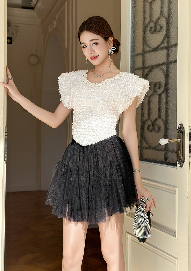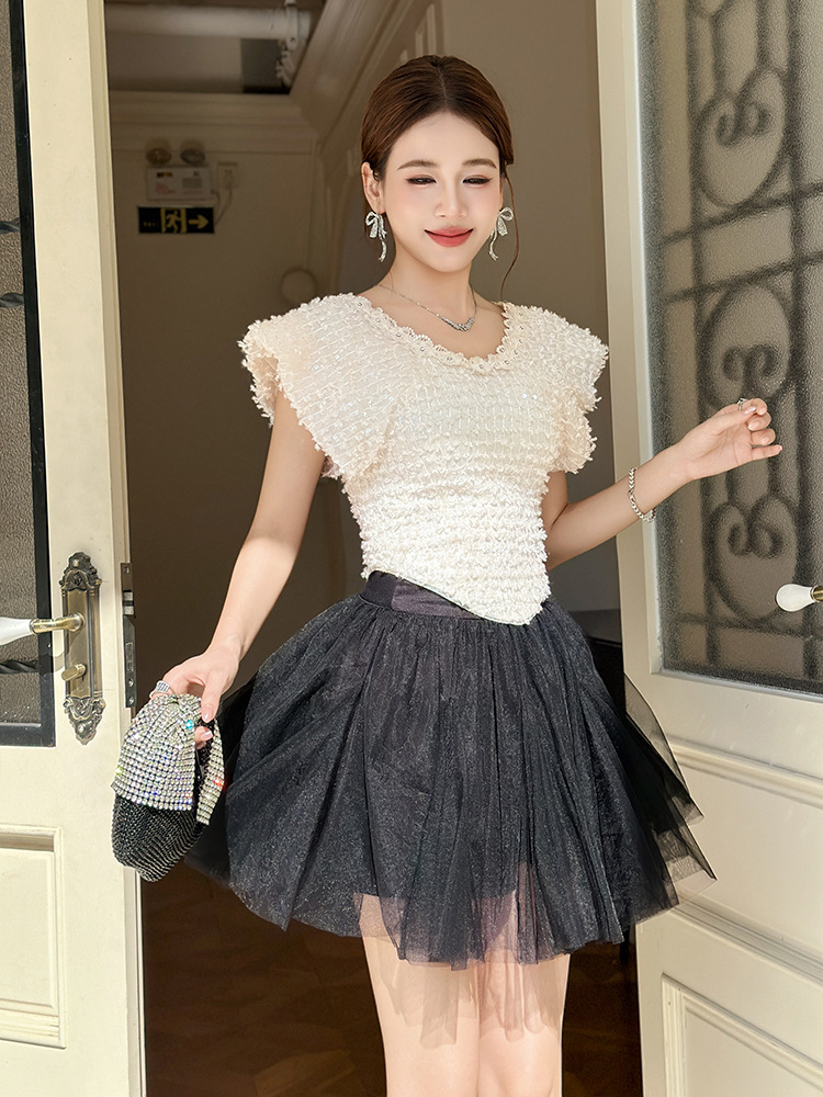C-4508# 2025早秋新款女装法式圆领泡泡袖收腰上衣设计感短款T恤女82024