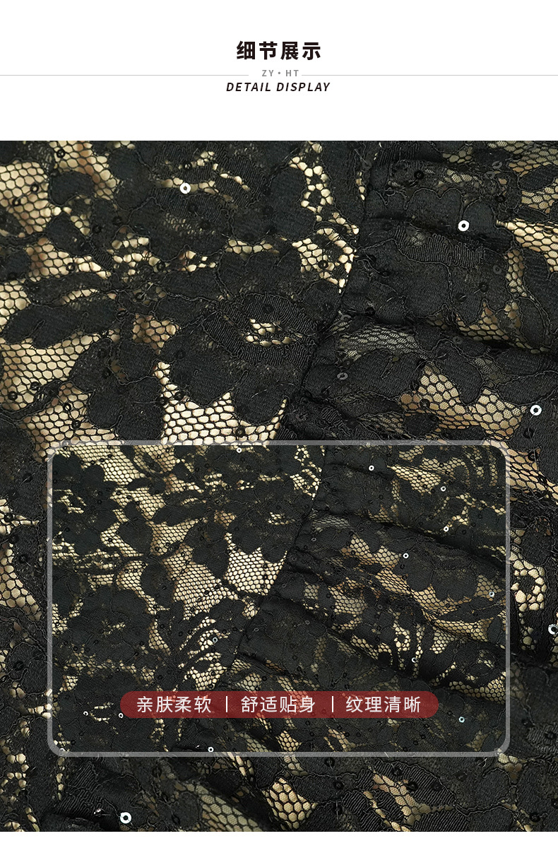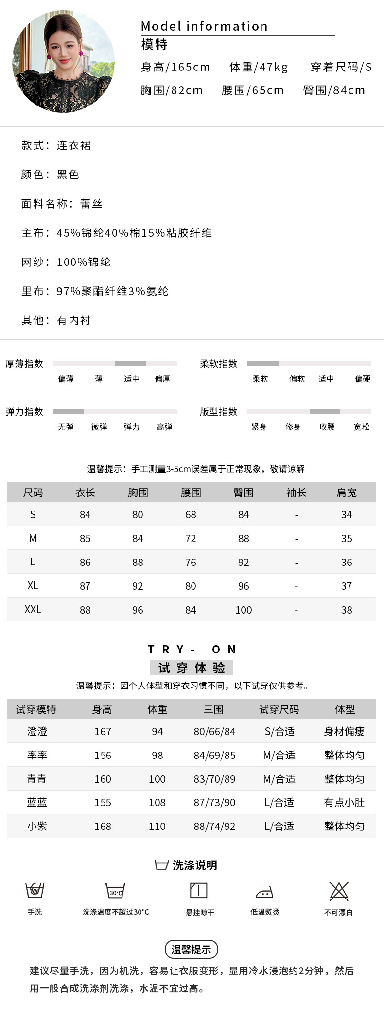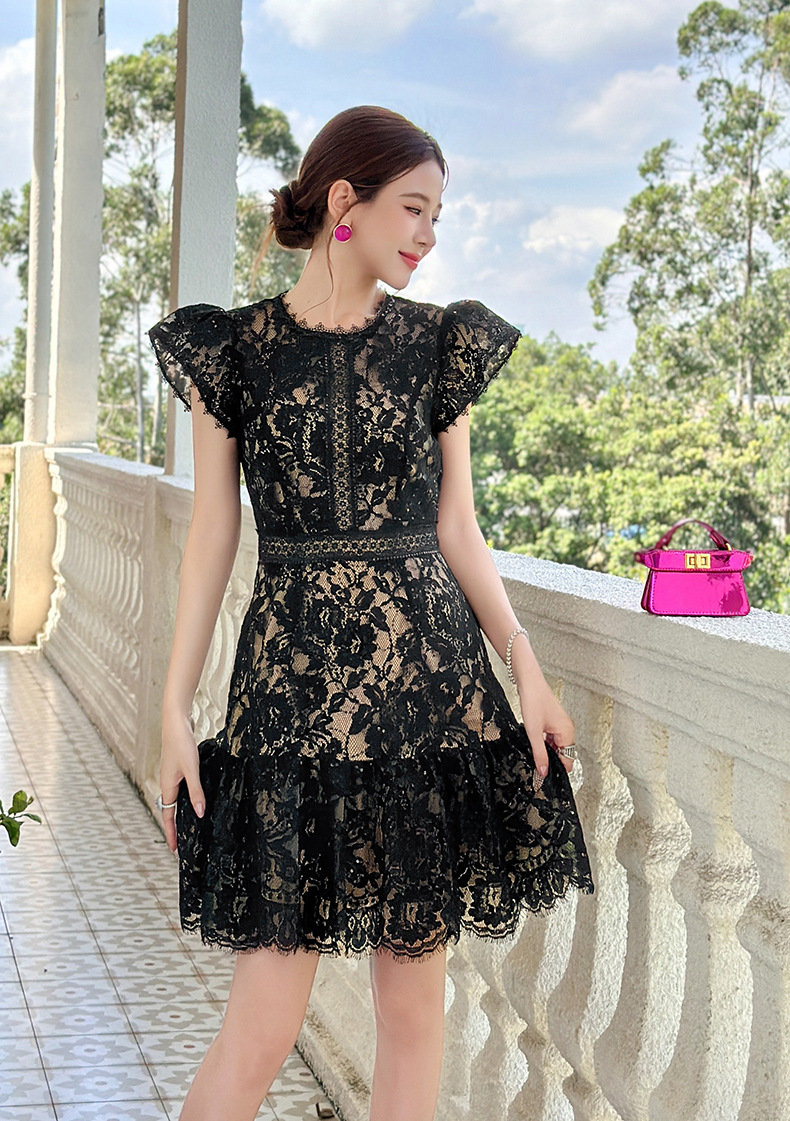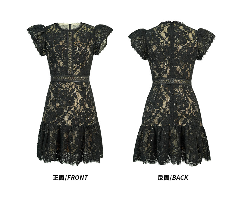 C-4517# 2025早秋新款女装法式圆领飞飞袖修身显瘦黑色蕾丝连衣裙21808