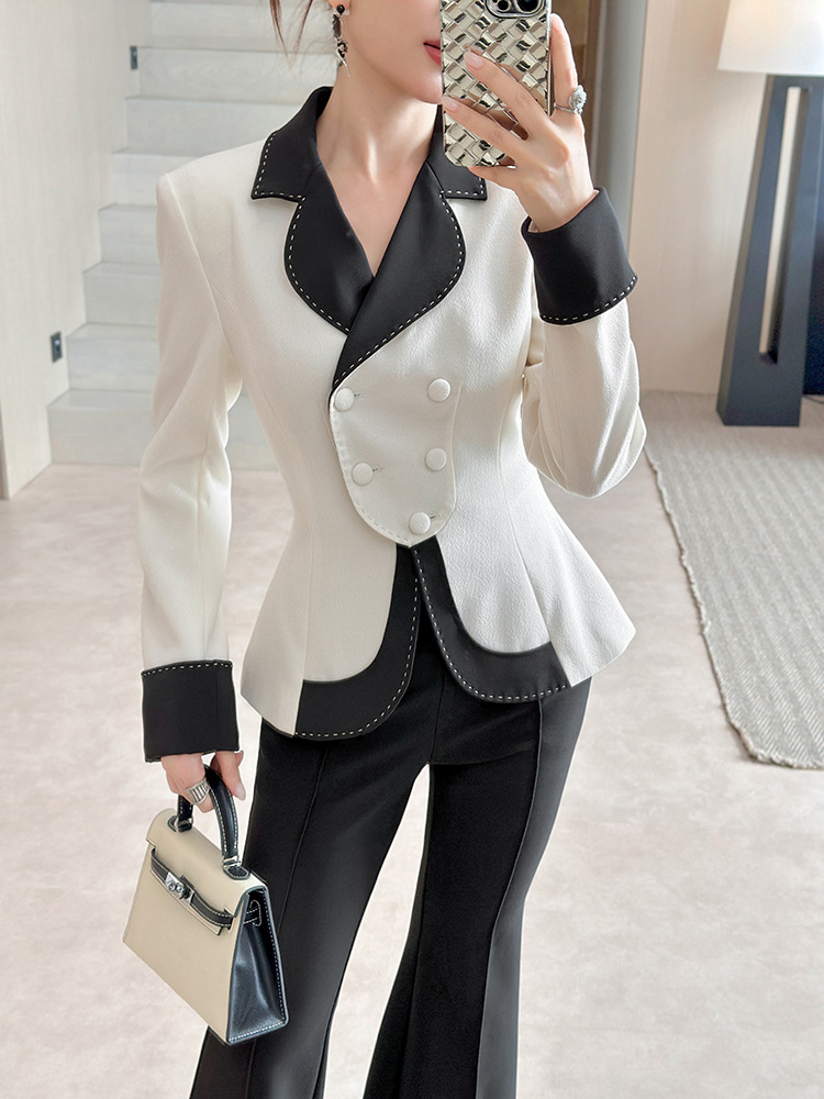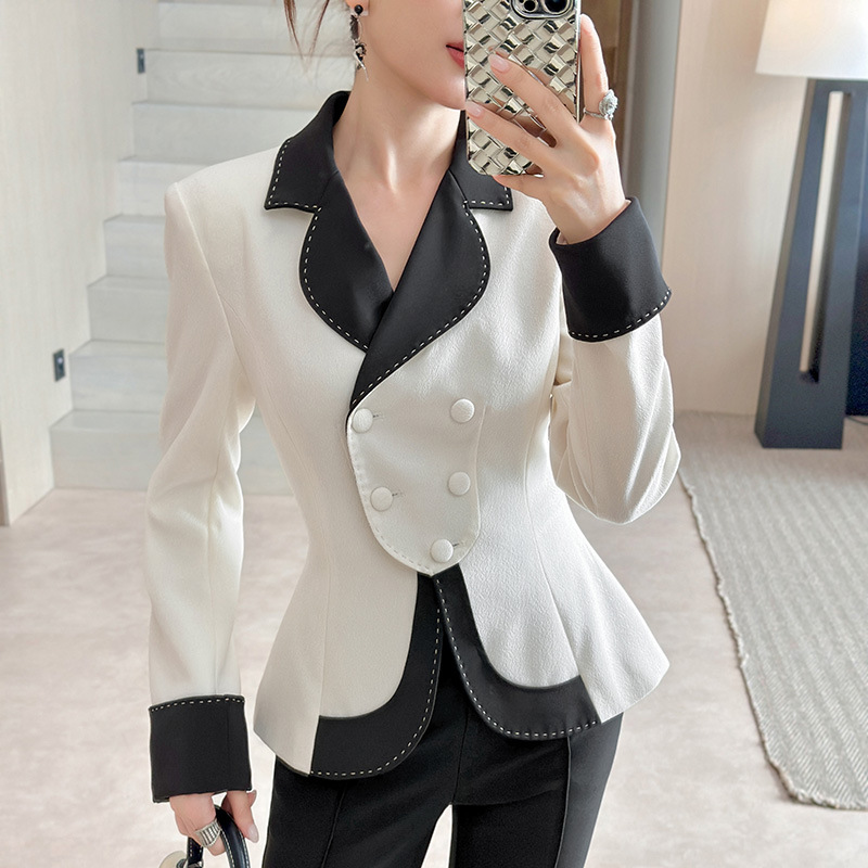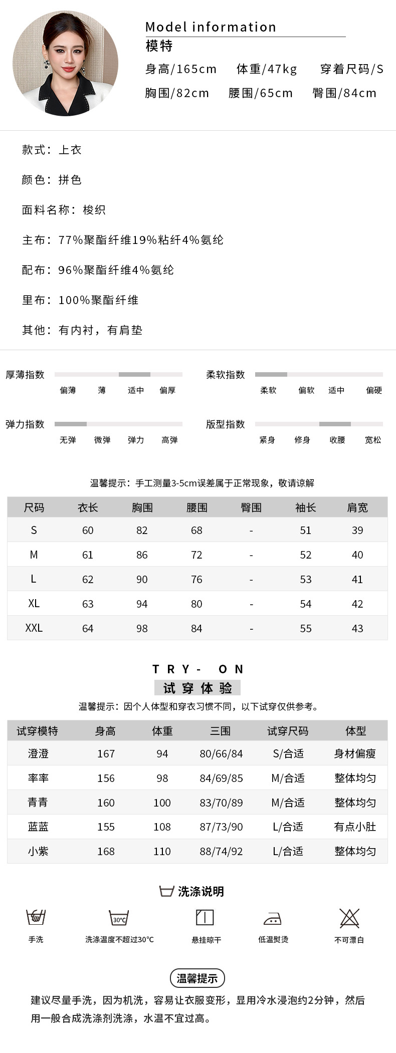 小C-4523# 香风黑白拼接西装外套女轻熟风双排扣收腰百搭通勤上衣秋35253