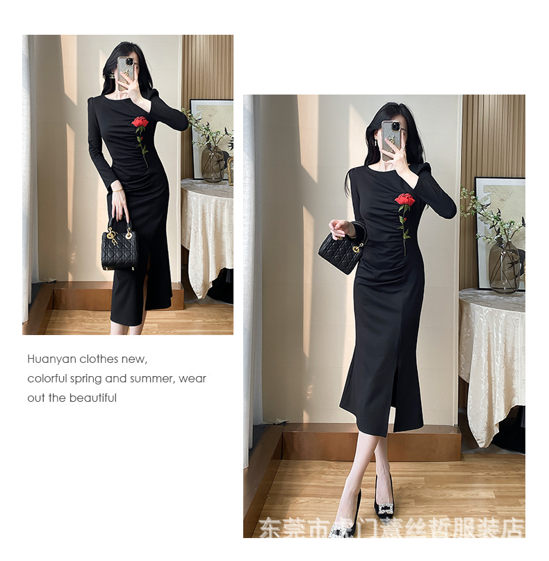A-8271# 2639修身黑色玫瑰花包臀气质长裙秋冬连衣裙标价不得低于238
