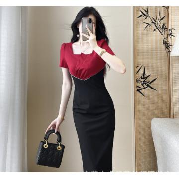 A-8281# 2625气质设计感拼接连衣裙显瘦方领法式修身包臀标价不得低于238